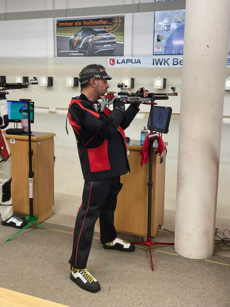 Schiesskleidung nach Mass, entspricht den aktuell gültigen ISSF Regeln, Polyestercanvas/Leder. Farbwahl möglich. Lieferzeit nach Massabgabe ca. 2 Wochen. Preis gültig bis 31.12.25
