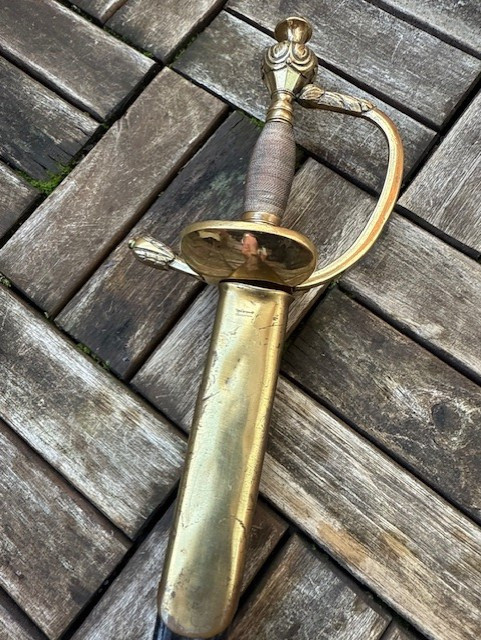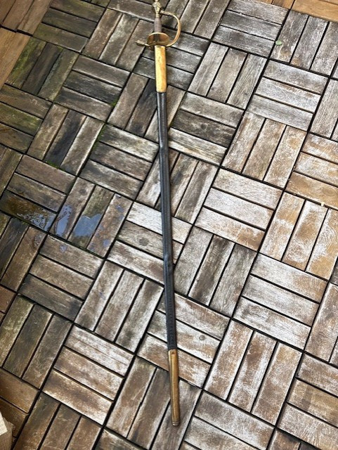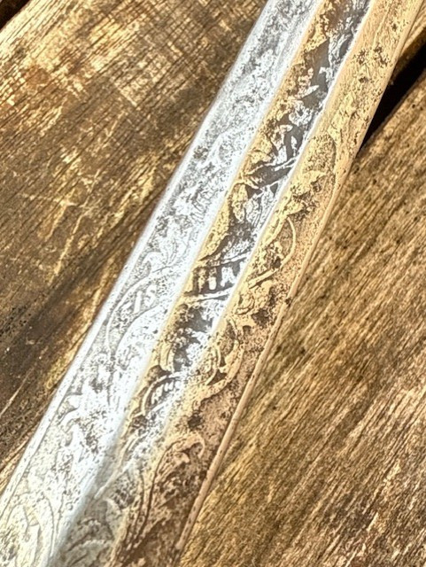 Preißen: IOD alter Art mit Echtdamastklinge, diese zusätzlich noch mit Zierätzungen. Zugehörige Lederscheide.