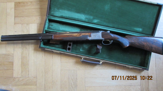 Browning Arms Stempelung auf dem Lauf aber hergestellt bei FN in Belgien; SNR: 325PP01092, gültiger Beschuss (kein Stahlschrotbeschuss) ist vorhanden; Verschluss auch bei abgenommenem Vorderschaft dicht, Basküle mit B2 Gravur aus Flugwildmotiven links und rechts, Rosetten, Arabesken und partiellem Randstich, ventilierte und guillochierte 12mm breite zur Basküle auf 7mm verjüngende Laufschiene mit weißem Perlkorn und mittigem Hilfskorn, Schiebe-Umschaltsicherung auf dem Kolbenhals, Ejektoren, Chokebohrungen oben und unten Skeet, rechts geschränkt. Lieferung in originalem Browning Koffer (keine Schlüssel mehr vorhanden).