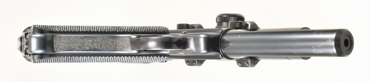 Gebrauchte KK - Trainingspistole / Sportpistole des amerikanischen Herstellers Sturm, Ruger & Co. Inc. MK II in brünierter Target Ausführung. Spiegelblanker, " Bull Barrel " Match - Lauf . Mellrichstädter Beschuß 1998. Frankonia Vertriebsstempel. Originale schwarze Kunststoffgriffschalen mit Fischhautmuster. Montiertes HUNTER Kurzwaffen - Zielfernrohr 2,5 x 20 mit Crosshair Absehen. 2 Stück Reservemagazine. Eigenbau Laufgewicht. Details siehe Bilder.