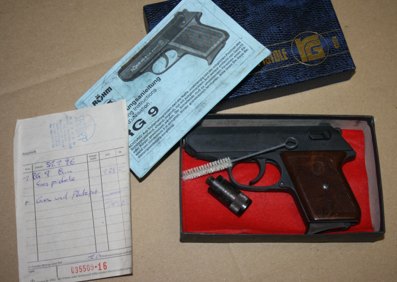 Sie bieten auf eine absolut neuwertige Rhöm RG9 im Kal. 8mm knall. Die Pistole stammt aus Erstbesitz und kommt in der originalen Verpackung mit dem abgebildeten Zubehör. Funktion einwandfrei. Gehört vom neuen Besitzer behutsam gereinigt. Verkauf ohne Garantie und Gewähr.