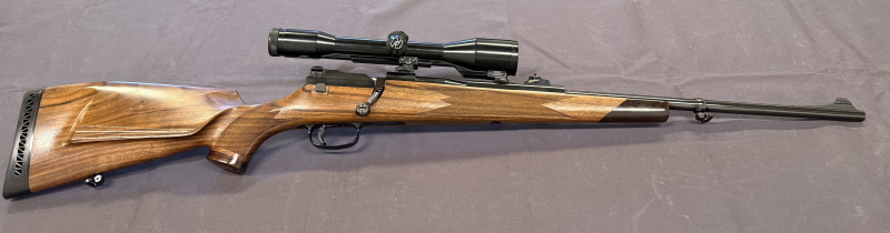 Zustand: Der Schaft zeigt minimale Gebrauchsspuren. Die Brünierung und das Zielfernrohr sind neuwertig. Sehr gute Schussleistung.
