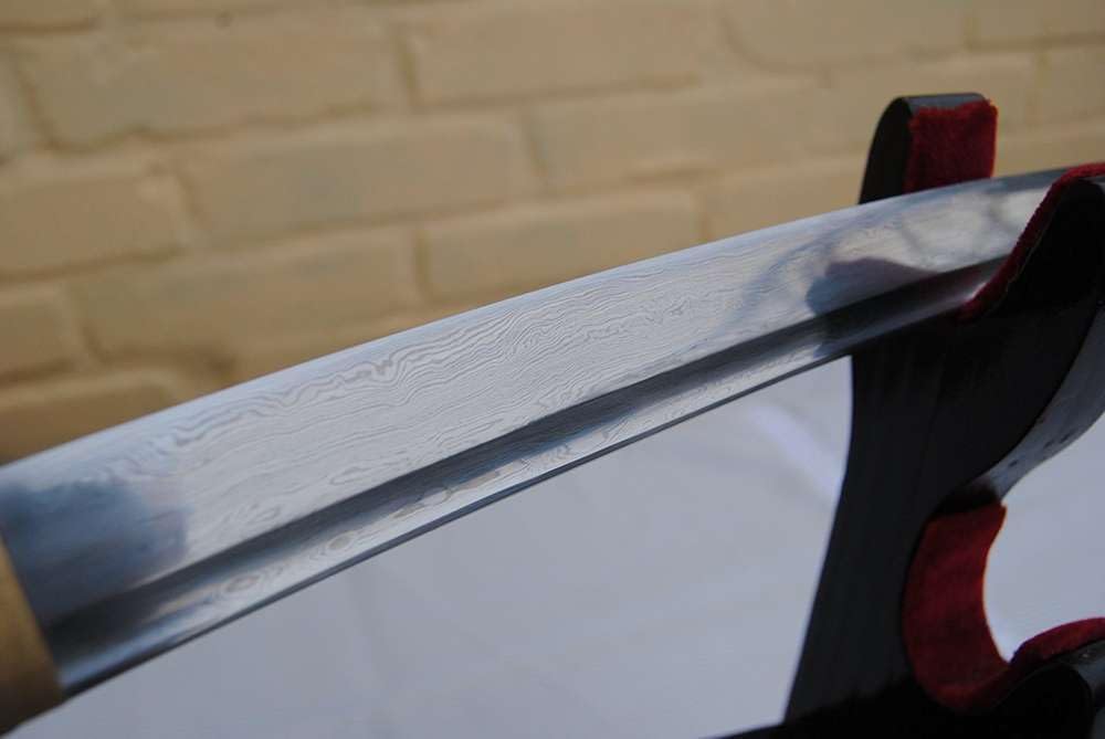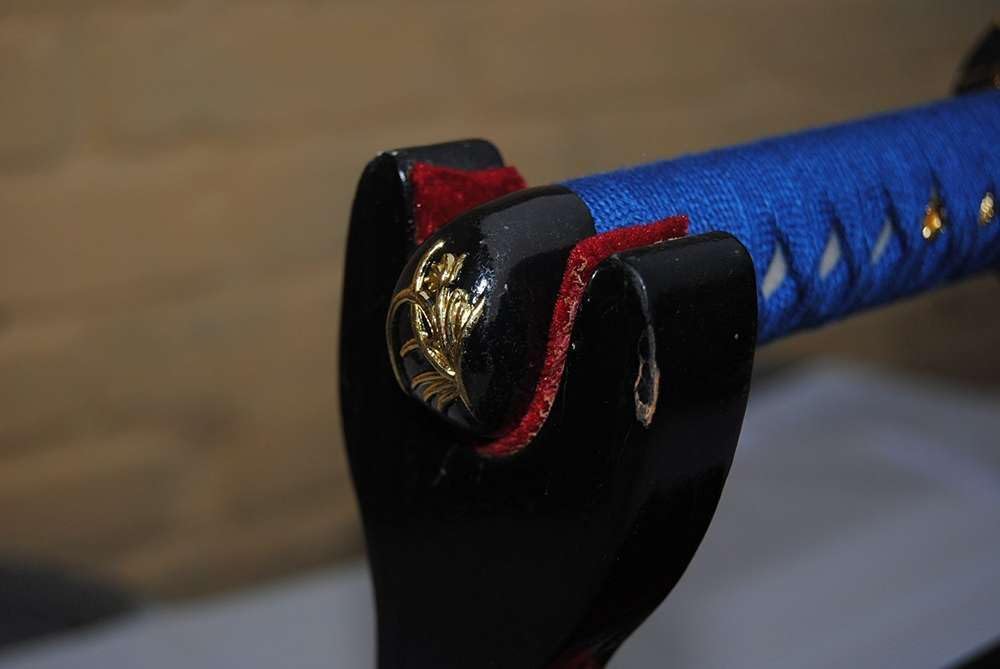 Gefaltetes Samurai Schwert Tanto Orchidee. Das Schwert ist aus handgefaltetem Kohlenstoffstahl nach traditioneller Art geschmiedet. Der Damststahl wurde 12 mal gefaltet. Die Klinge wurde nach dem Polieren und Schleifen nochmals speziell behandelt. Die Tsuka ist aus Holz, mit echter Rochenhaut unterlegt und blauer Baumwolle umwickelt. Am Griff sind zwei Mekugis (Bambusdübel) angebracht. OHNE STÄNDER .Dieses Tanto ist vollständig zerlegbar und scharf geschliffen. Gesamtlänge mit Scheide : 58cm Klingenlänge : 34 cm Griff : 19,5cm Erhältlich ab 18Jahren.