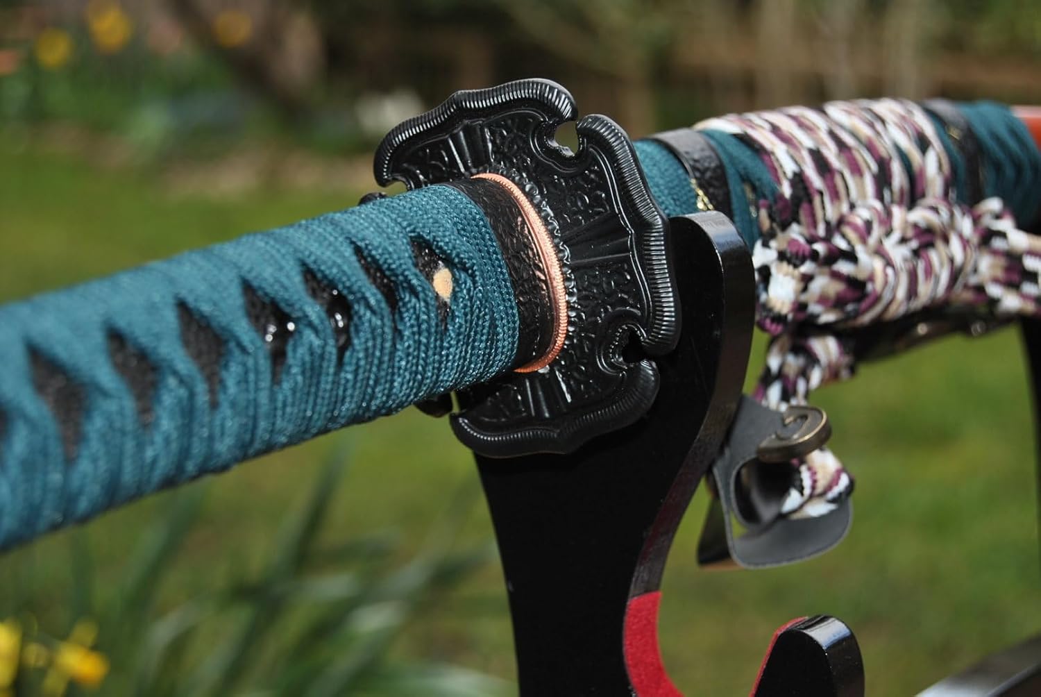 Wunderschöne Handgeschmiedete Katana Samurai Schwert aus aller besten Stahl 1045 die durch das harmonische Zusammenspiel mit Saya und Tsuka zu einem vollkommenen Kunstwerk gemacht wurde. Das Schwert wird mit Schwertbeutel geliefert. Die gesamte Länge des Schwertes ist 104cm, die Klingenlänge 73cm und der Griff ist 28cm lang.Klingenbreite: 3,2 cm cm Klingenrücken: 8 mm Die Saya ist Schwarz lackiert. Die Zubehörteile haben ein Tanaka Samurai Design und sind aus Metall, der Habaki ist aus massiven Messing. Der Griff ist aus Holz und in Rochenhaut eingelegt.Dieses Schwert ist nicht nur ein Kunstwerk das in höchstem Maße dekorativ ist, sondern es ist auch scharf und vollkommen geeignet für echte Kämpfe und Schnittübungen. Die Klinge besitzt eine BO-HI.Die Klinge ist, zwecks Größerer Sicherheit, mit zwei mekugi (Bambus Zapfen) befestigt. .Ohne Ständer