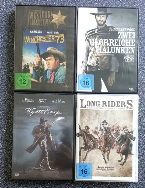 Biete 4 Stück Western DVD: 1. Winchester´73 mit James Steward 89Min. 2. Zwei glorreiche Halunken mit Clint Eastwood 171Min. 3. Wyatt Earp mit Kevin Costner 182Min. 4. Long Riders mit Denis Quaid 96Min. Privatverkauf! KEINE Rücknahme!