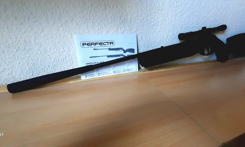 Luftdruckgewehr "Perfekta RS 26",4,5 mm,Knicklauf,mit Zieloptik,leichter Kuststoffschaft schwarz,grob eingeschossen,kaum benutzt,technisch und optisch i.O.,keine Gebrauchsspuren mit 1000 Diabolo