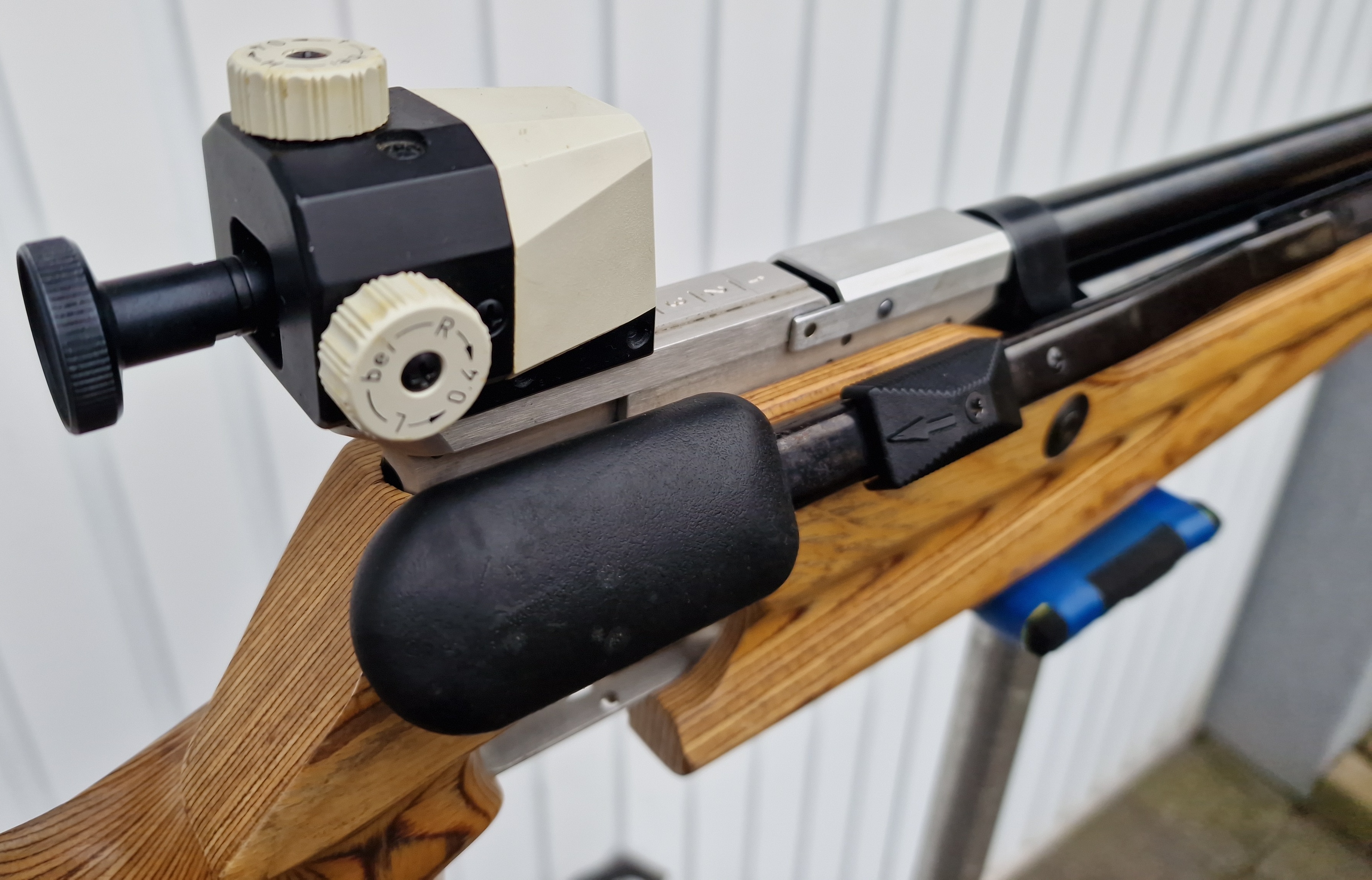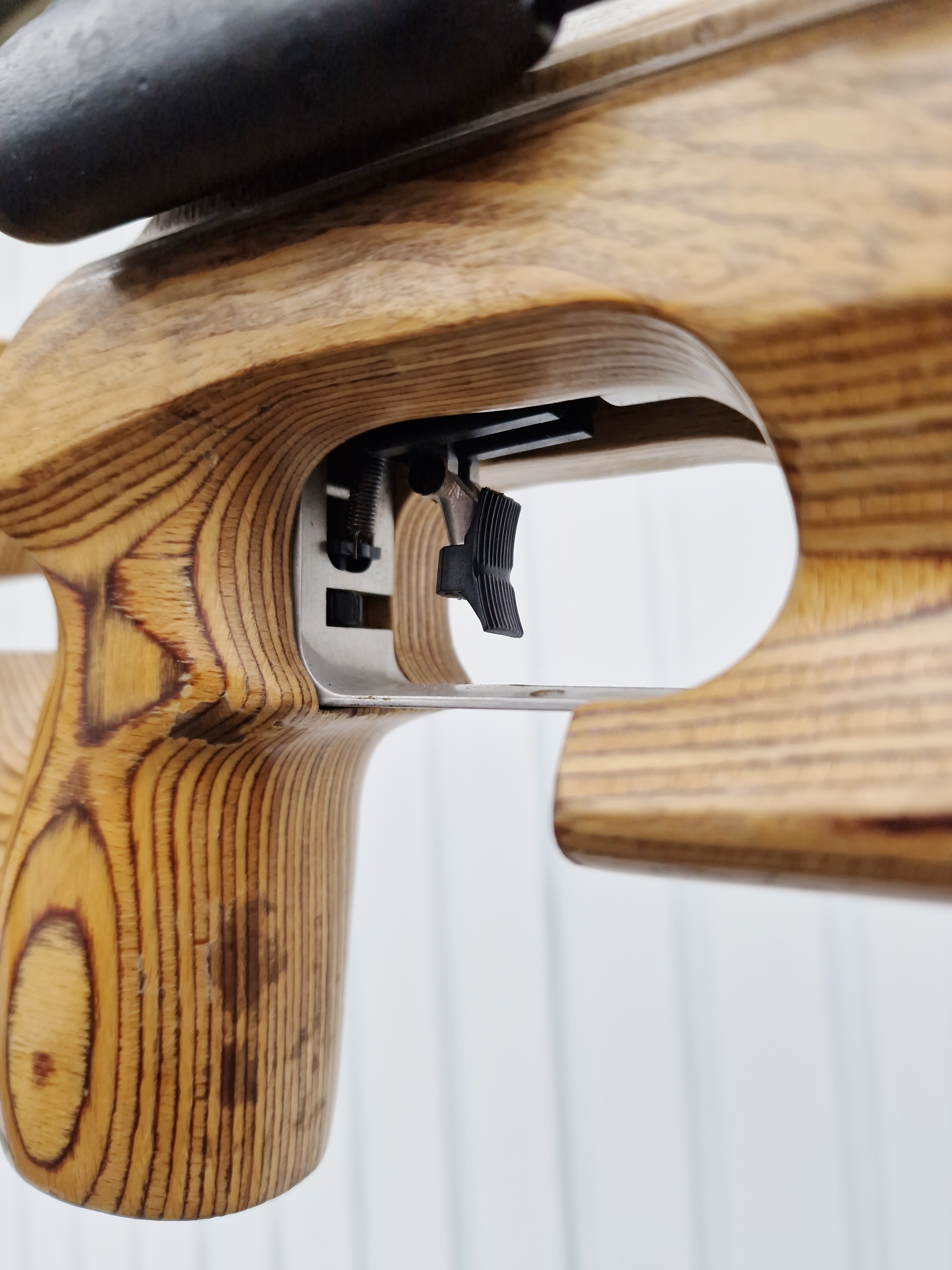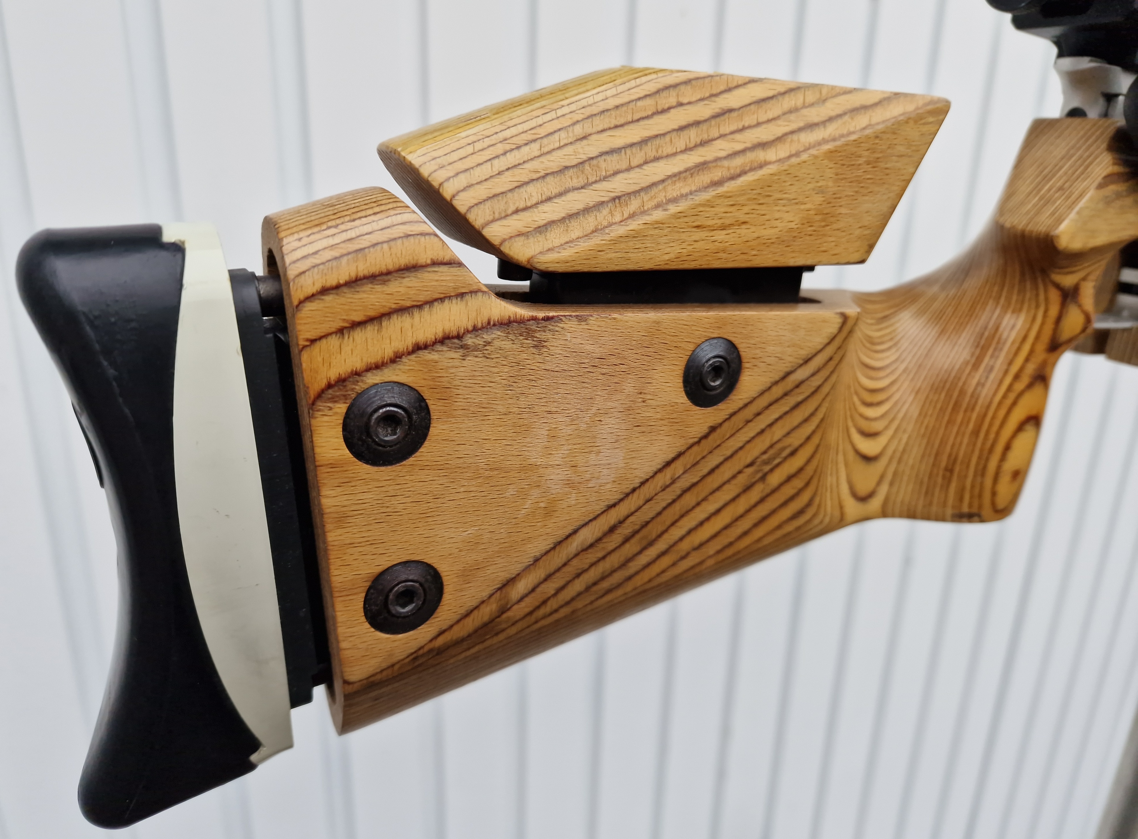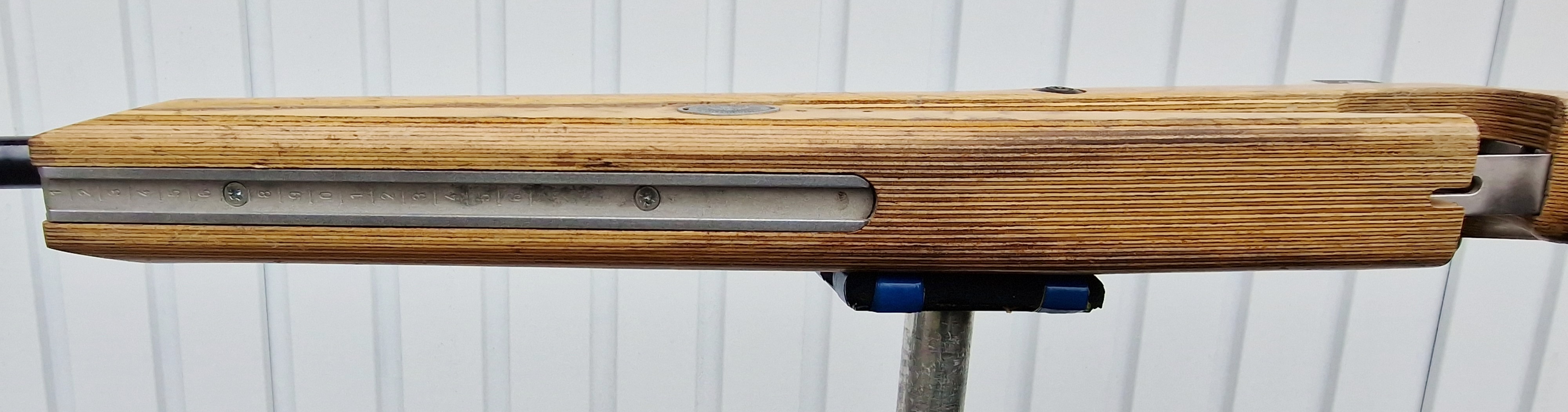 Heller Schichtholzschaft mit sichtbaren Gebrauchsspuren, oben auf der Schaftbacke löst sich der Klarlack.