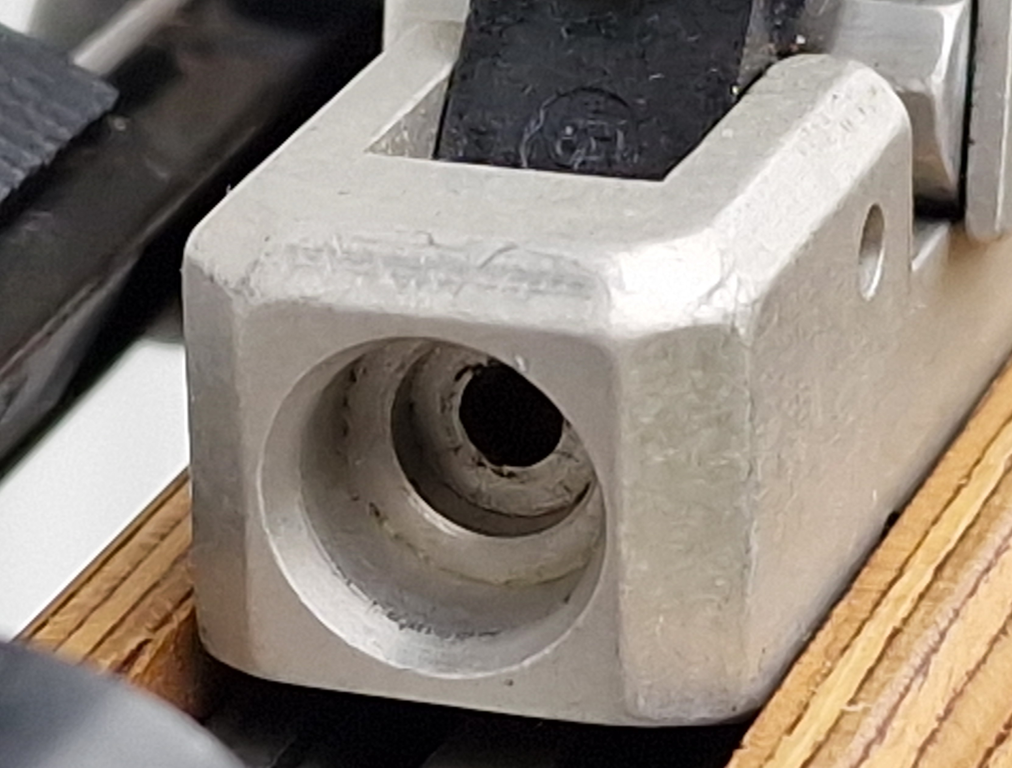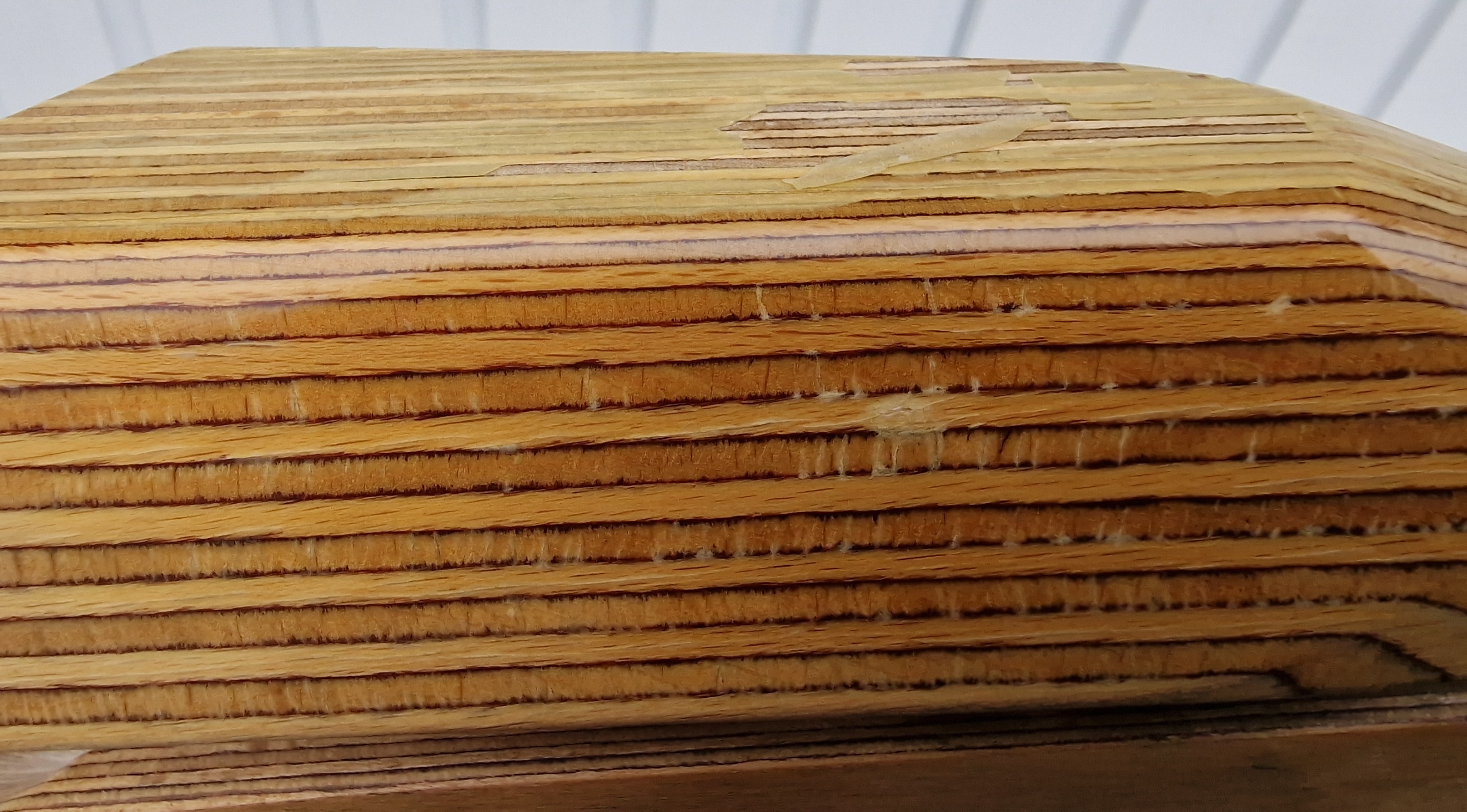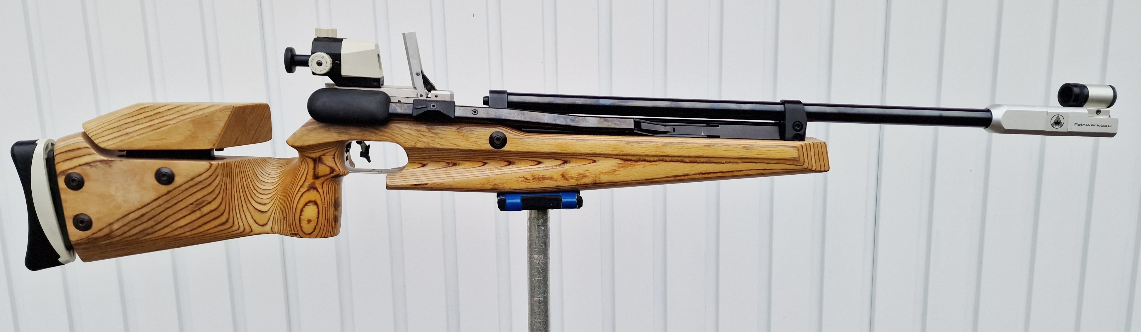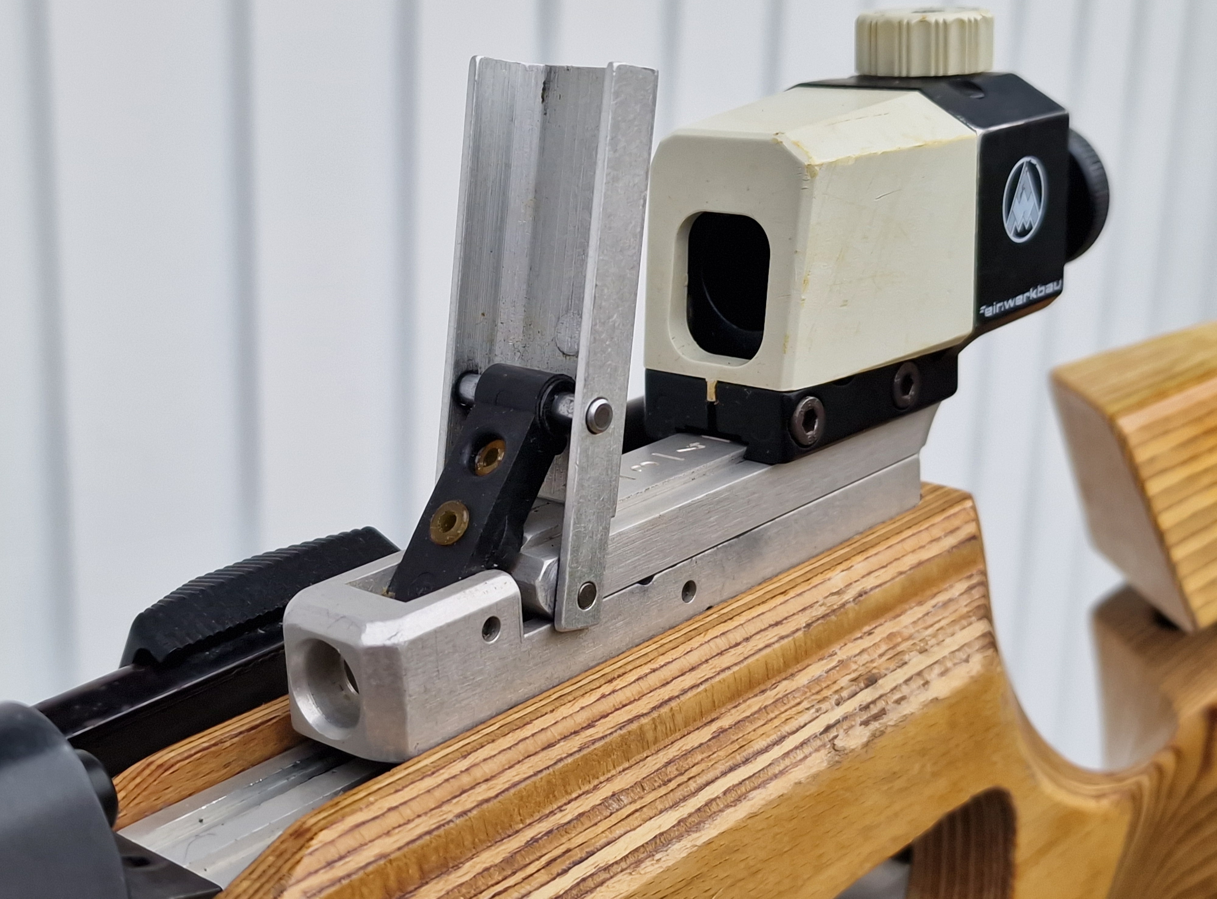 Heller Schichtholzschaft mit sichtbaren Gebrauchsspuren, oben auf der Schaftbacke löst sich der Klarlack.