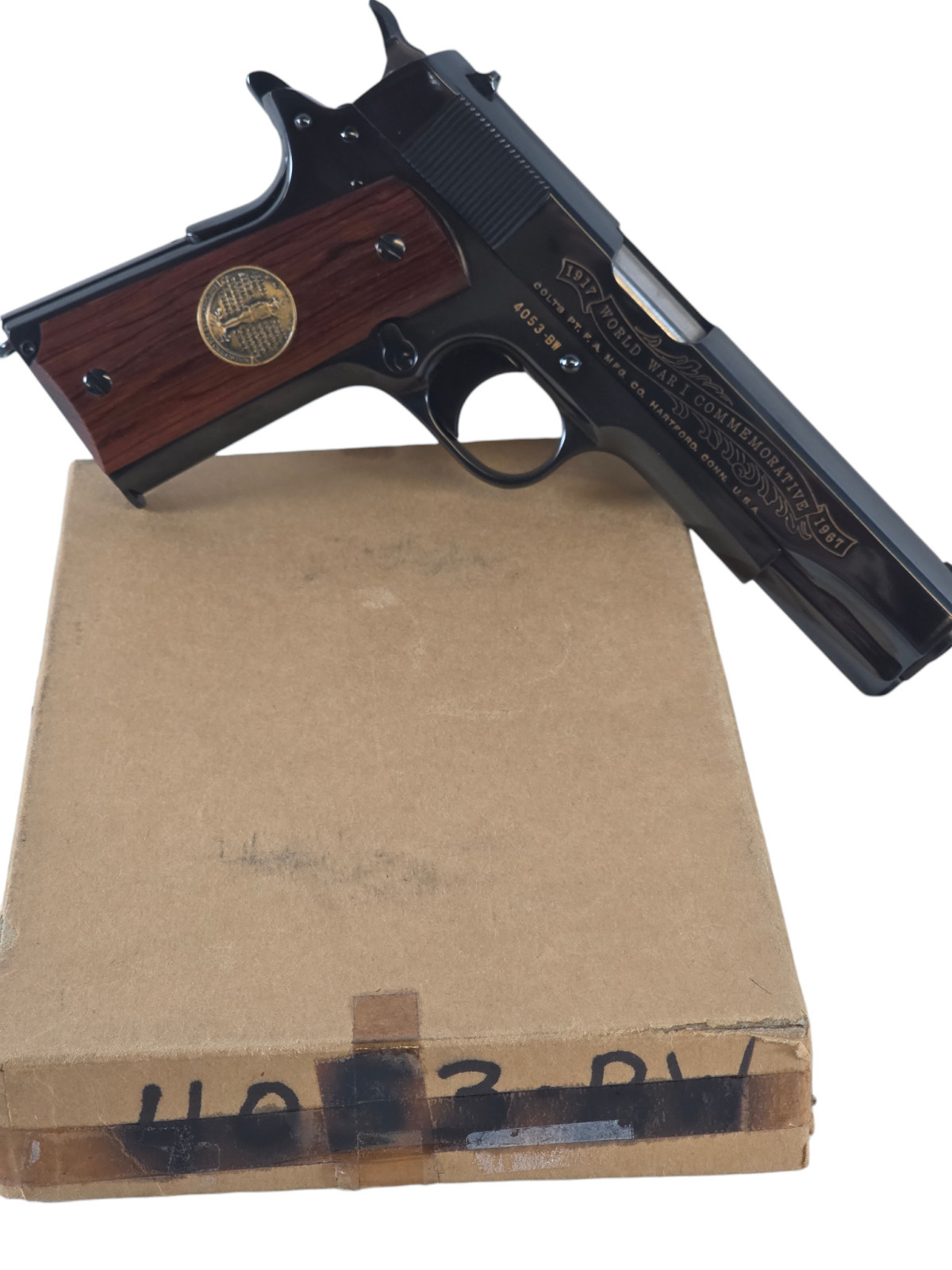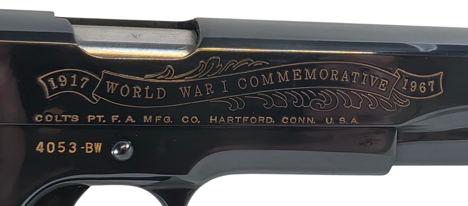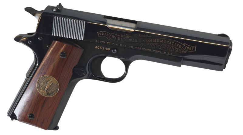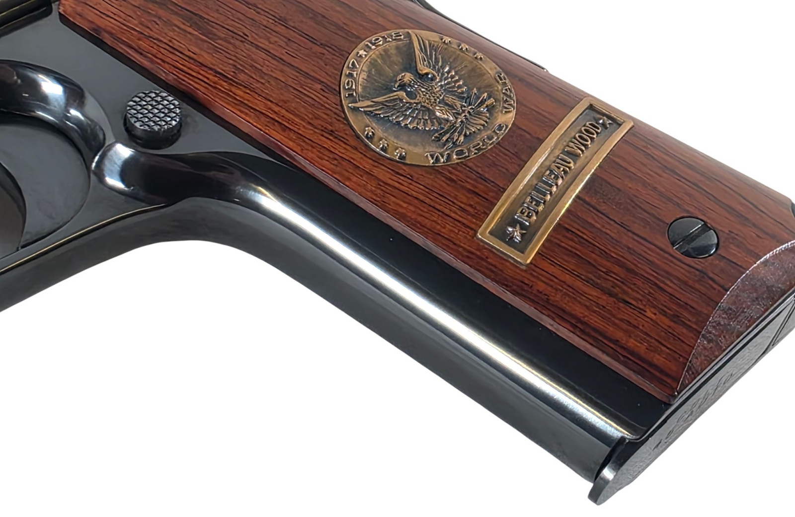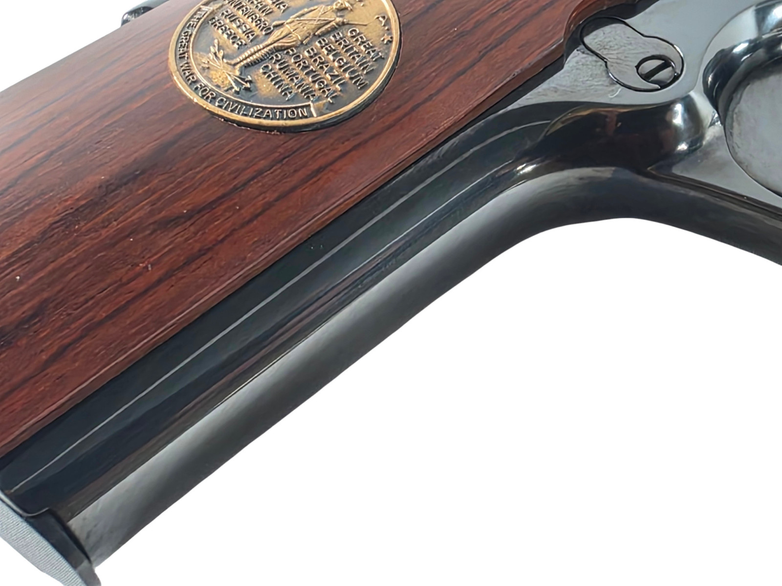 Hergestellt von Colt im Jahr 1967 als eine der Gedenkpistolen des Modells 1911 zum Ersten Weltkrieg. Ähnlich den 1911er-Modellen des Ersten Weltkriegs verfügt diese Pistole über einen 5-Zoll-Lauf mit flacher offener Visierung. Die Oberfläche ist in Colt Royal Blue gehalten. Die linke Seite des Verschlusses ist mit einer goldfarbenen Gravur versehen, die eine Schlachtszene mit amerikanischen Soldaten in einem Waldgebiet zeigt. Das Colt-Logo befindet sich am hinteren Ende des Verschlusses. Die rechte Seite ist ebenfalls goldfarben graviert und trägt die Aufschrift „1917 / WORLD WAR I COMMEMORATIVE / 1967“ mit der einzeiligen Colt-Adresse darunter. Die goldfarbene Seriennummer ist unten auf dem Rahmen eingeprägt. Der Colt-VP-Beschussstempel befindet sich am Auswurffenster des Laufs. Die Pistole ist halbautomatisch und verfügt über eine Griffsicherung und eine manuelle Daumensicherung. Sie ist mit Griffschalen mit Bronzemedaillons ausgestattet. Das runde Medaillon auf der linken Seite zeigt einen Adler mit der Aufschrift „1917-1918 / WORLD WAR“, das rechteckige Medaillon trägt die Aufschrift „BELLEAU WOOD“. Das Bronzemedaillon auf der rechten Seite zeigt einen US-Soldaten mit einer Liste der alliierten Länder. Die Pistole ist mit einer Fangriemenöse ausgestattet und wird mit einem 7-Schuss-Magazin im Originalkarton geliefert.