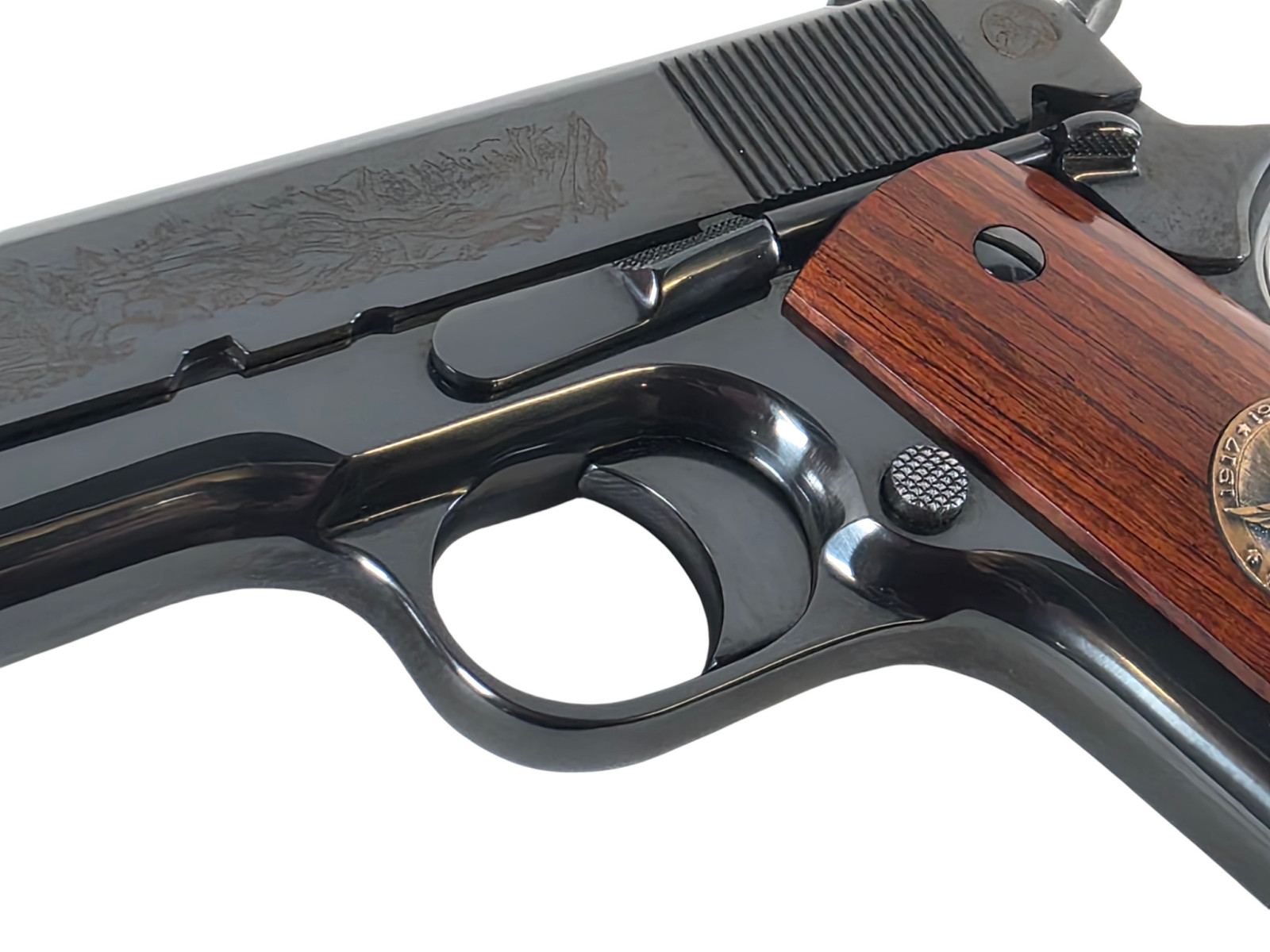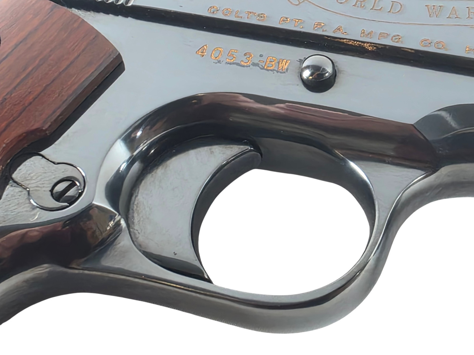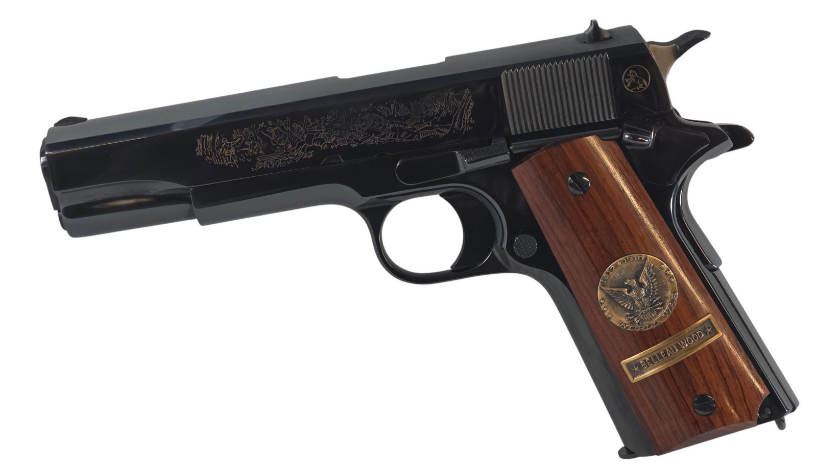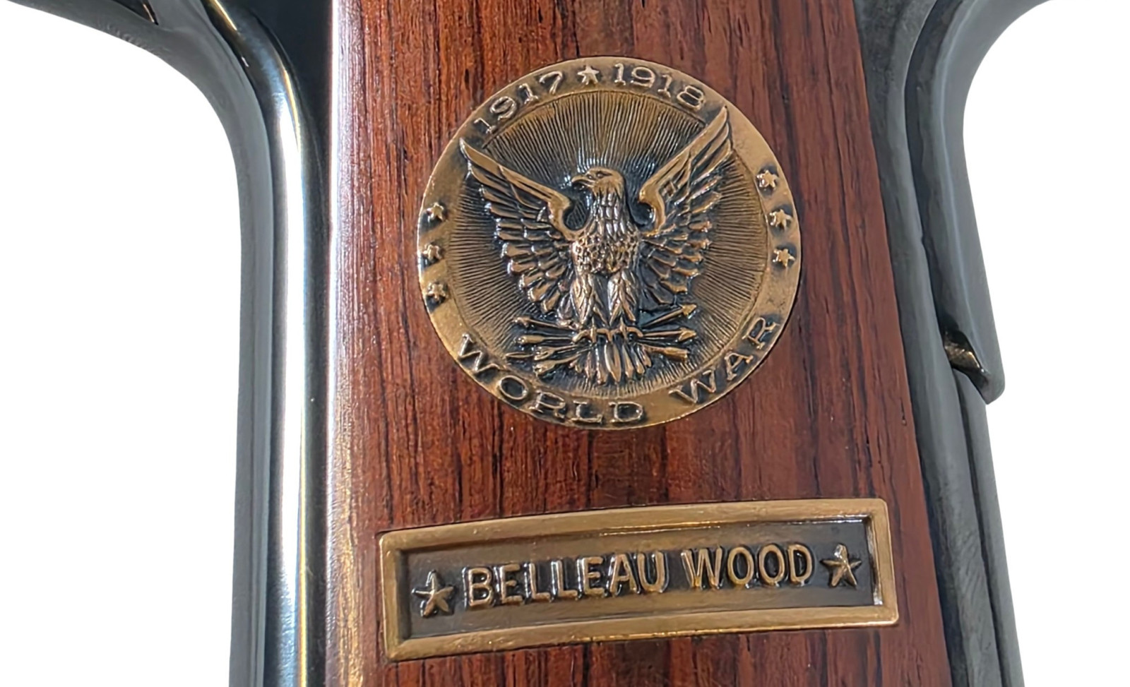 Hergestellt von Colt im Jahr 1967 als eine der Gedenkpistolen des Modells 1911 zum Ersten Weltkrieg. Ähnlich den 1911er-Modellen des Ersten Weltkriegs verfügt diese Pistole über einen 5-Zoll-Lauf mit flacher offener Visierung. Die Oberfläche ist in Colt Royal Blue gehalten. Die linke Seite des Verschlusses ist mit einer goldfarbenen Gravur versehen, die eine Schlachtszene mit amerikanischen Soldaten in einem Waldgebiet zeigt. Das Colt-Logo befindet sich am hinteren Ende des Verschlusses. Die rechte Seite ist ebenfalls goldfarben graviert und trägt die Aufschrift „1917 / WORLD WAR I COMMEMORATIVE / 1967“ mit der einzeiligen Colt-Adresse darunter. Die goldfarbene Seriennummer ist unten auf dem Rahmen eingeprägt. Der Colt-VP-Beschussstempel befindet sich am Auswurffenster des Laufs. Die Pistole ist halbautomatisch und verfügt über eine Griffsicherung und eine manuelle Daumensicherung. Sie ist mit Griffschalen mit Bronzemedaillons ausgestattet. Das runde Medaillon auf der linken Seite zeigt einen Adler mit der Aufschrift „1917-1918 / WORLD WAR“, das rechteckige Medaillon trägt die Aufschrift „BELLEAU WOOD“. Das Bronzemedaillon auf der rechten Seite zeigt einen US-Soldaten mit einer Liste der alliierten Länder. Die Pistole ist mit einer Fangriemenöse ausgestattet und wird mit einem 7-Schuss-Magazin im Originalkarton geliefert.