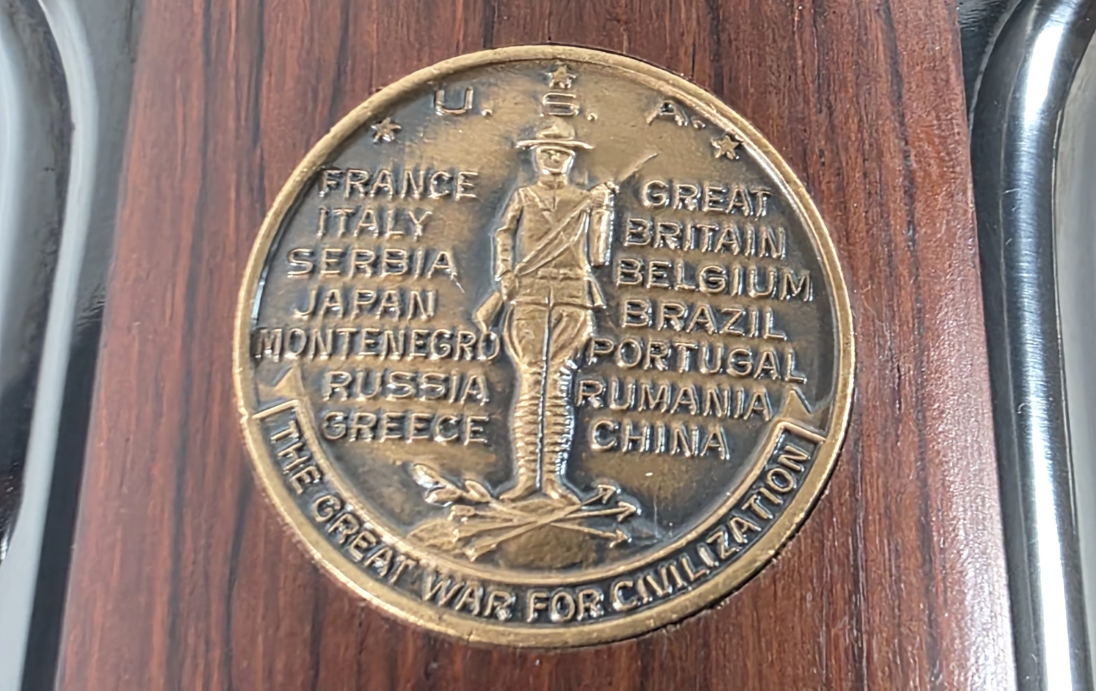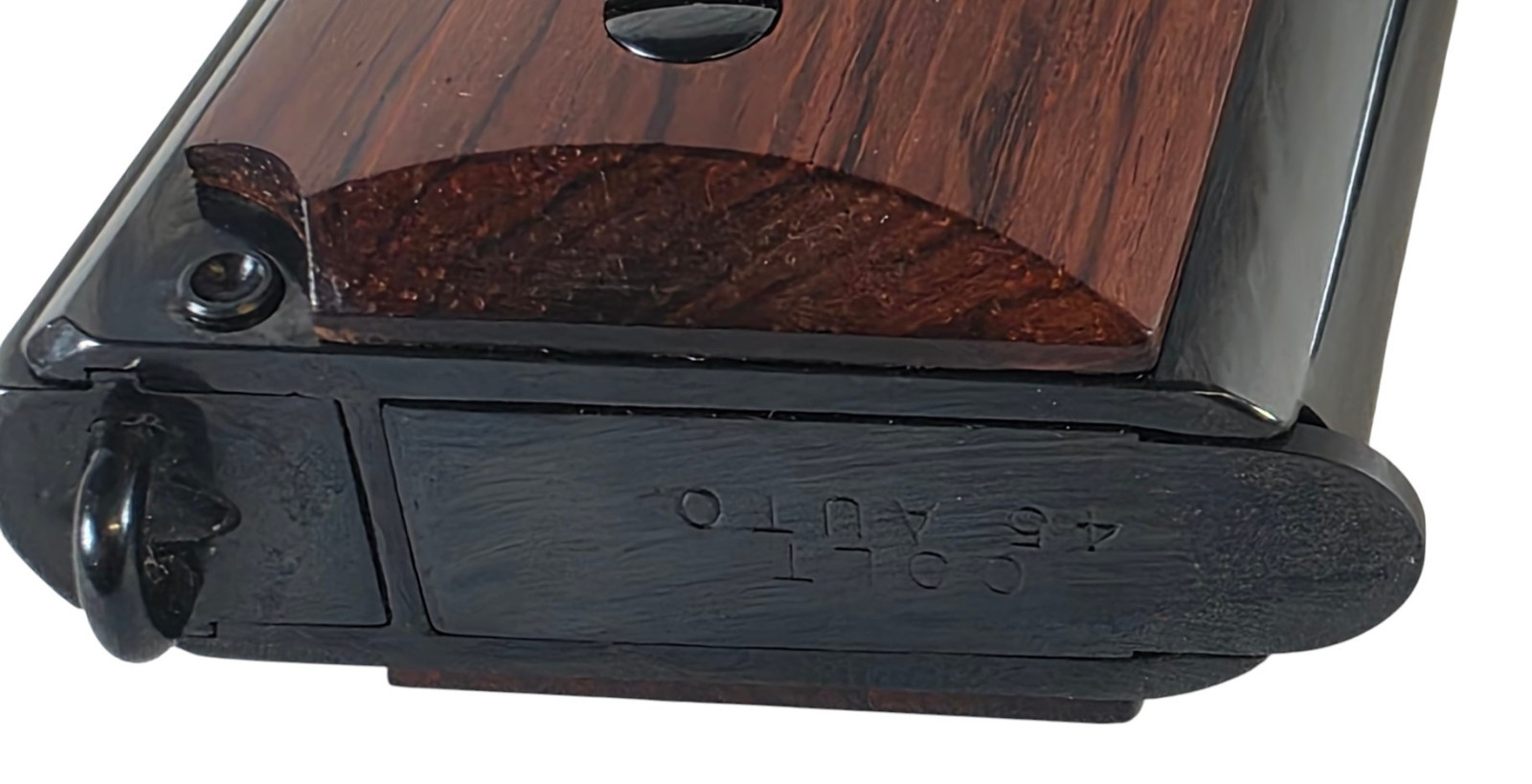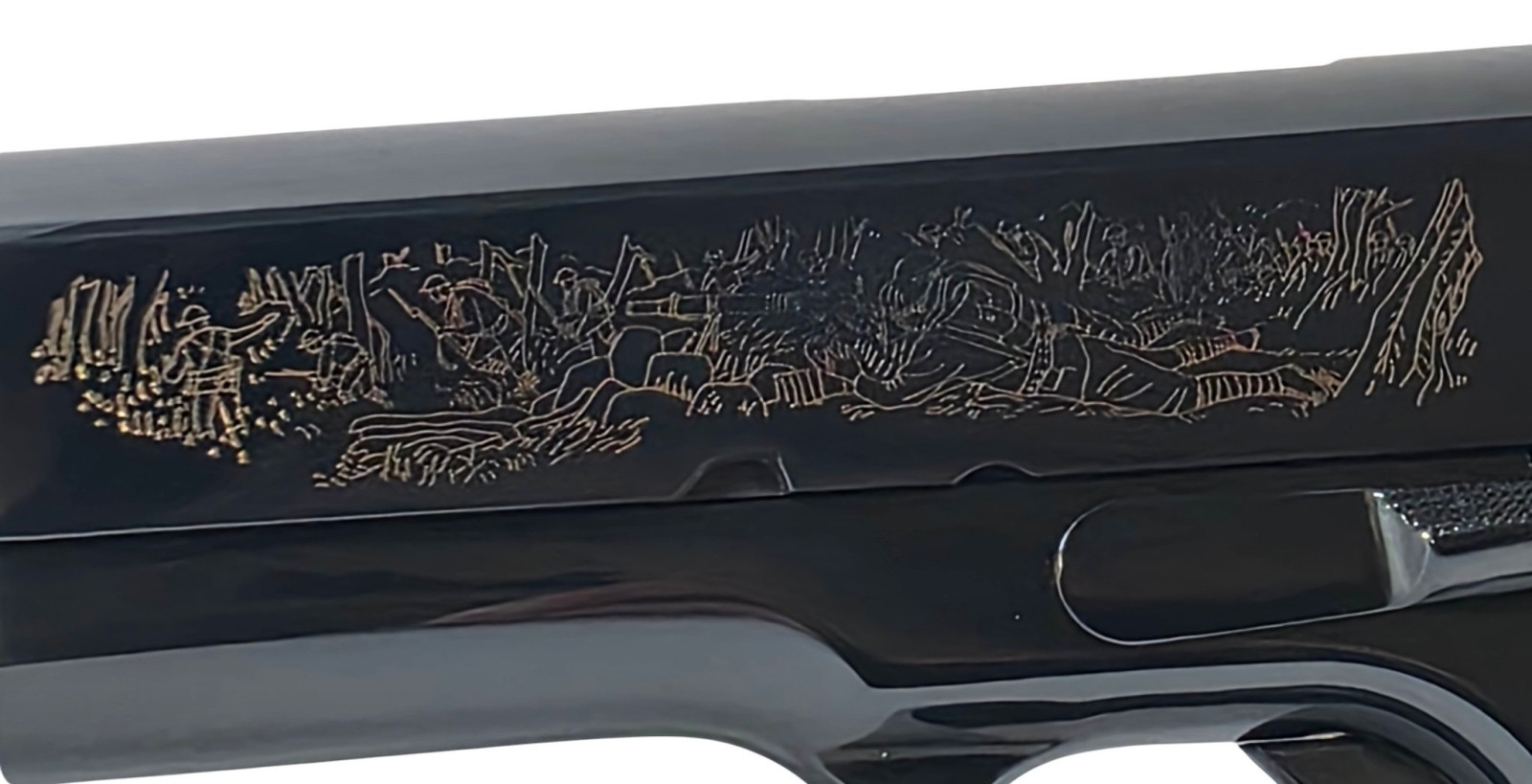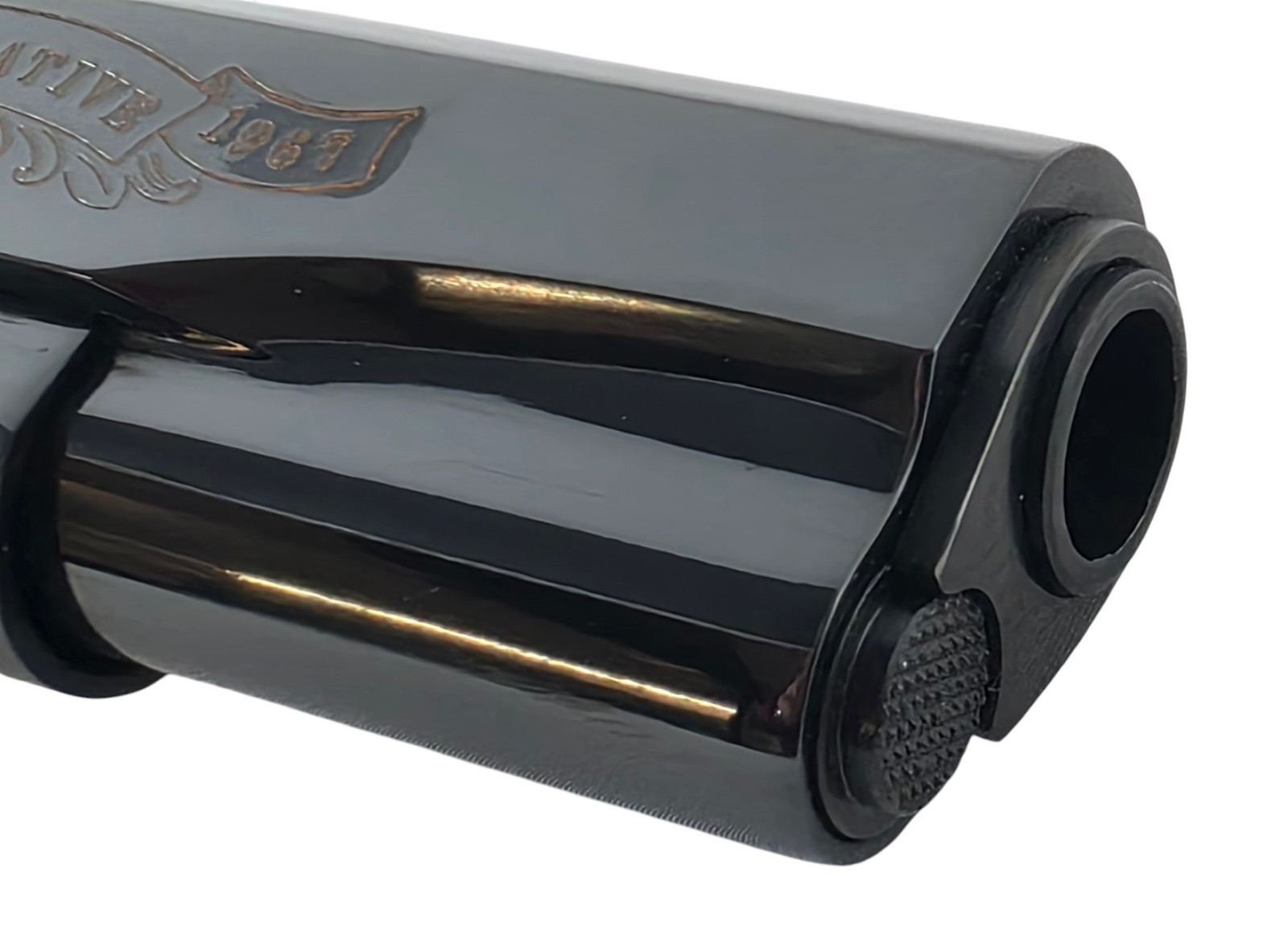 Hergestellt von Colt im Jahr 1967 als eine der Gedenkpistolen des Modells 1911 zum Ersten Weltkrieg. Ähnlich den 1911er-Modellen des Ersten Weltkriegs verfügt diese Pistole über einen 5-Zoll-Lauf mit flacher offener Visierung. Die Oberfläche ist in Colt Royal Blue gehalten. Die linke Seite des Verschlusses ist mit einer goldfarbenen Gravur versehen, die eine Schlachtszene mit amerikanischen Soldaten in einem Waldgebiet zeigt. Das Colt-Logo befindet sich am hinteren Ende des Verschlusses. Die rechte Seite ist ebenfalls goldfarben graviert und trägt die Aufschrift „1917 / WORLD WAR I COMMEMORATIVE / 1967“ mit der einzeiligen Colt-Adresse darunter. Die goldfarbene Seriennummer ist unten auf dem Rahmen eingeprägt. Der Colt-VP-Beschussstempel befindet sich am Auswurffenster des Laufs. Die Pistole ist halbautomatisch und verfügt über eine Griffsicherung und eine manuelle Daumensicherung. Sie ist mit Griffschalen mit Bronzemedaillons ausgestattet. Das runde Medaillon auf der linken Seite zeigt einen Adler mit der Aufschrift „1917-1918 / WORLD WAR“, das rechteckige Medaillon trägt die Aufschrift „BELLEAU WOOD“. Das Bronzemedaillon auf der rechten Seite zeigt einen US-Soldaten mit einer Liste der alliierten Länder. Die Pistole ist mit einer Fangriemenöse ausgestattet und wird mit einem 7-Schuss-Magazin im Originalkarton geliefert.