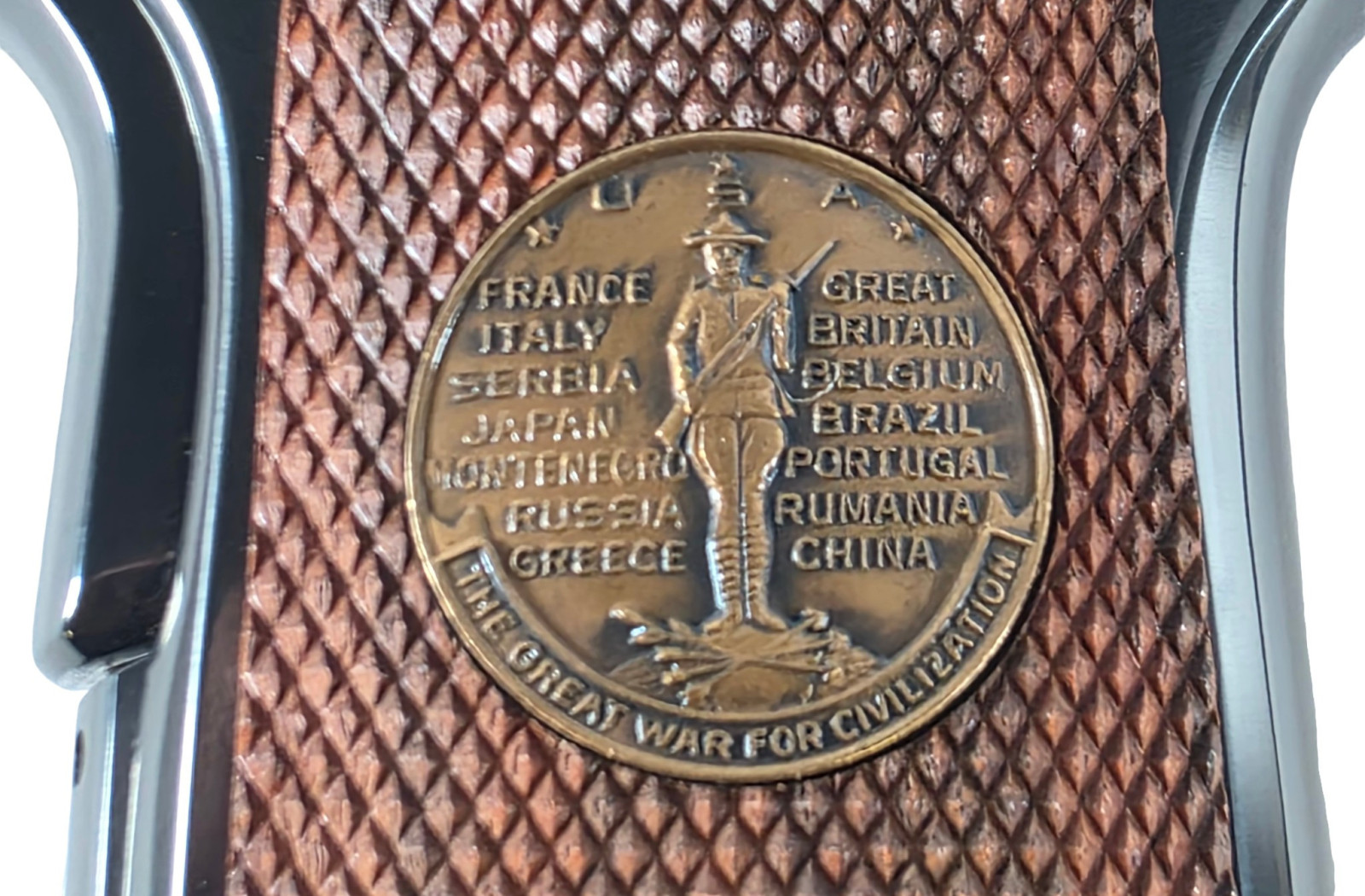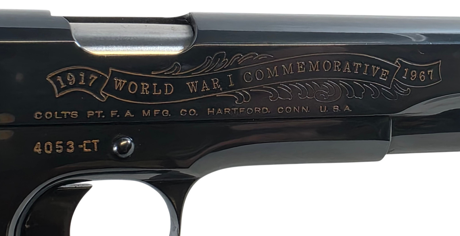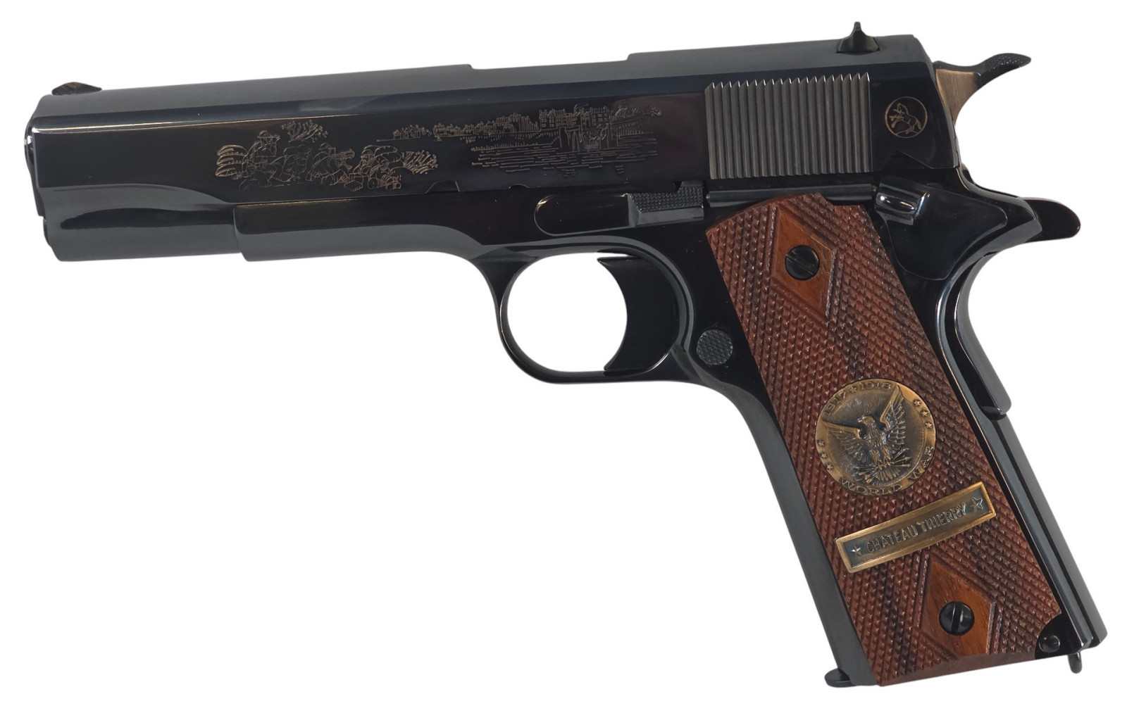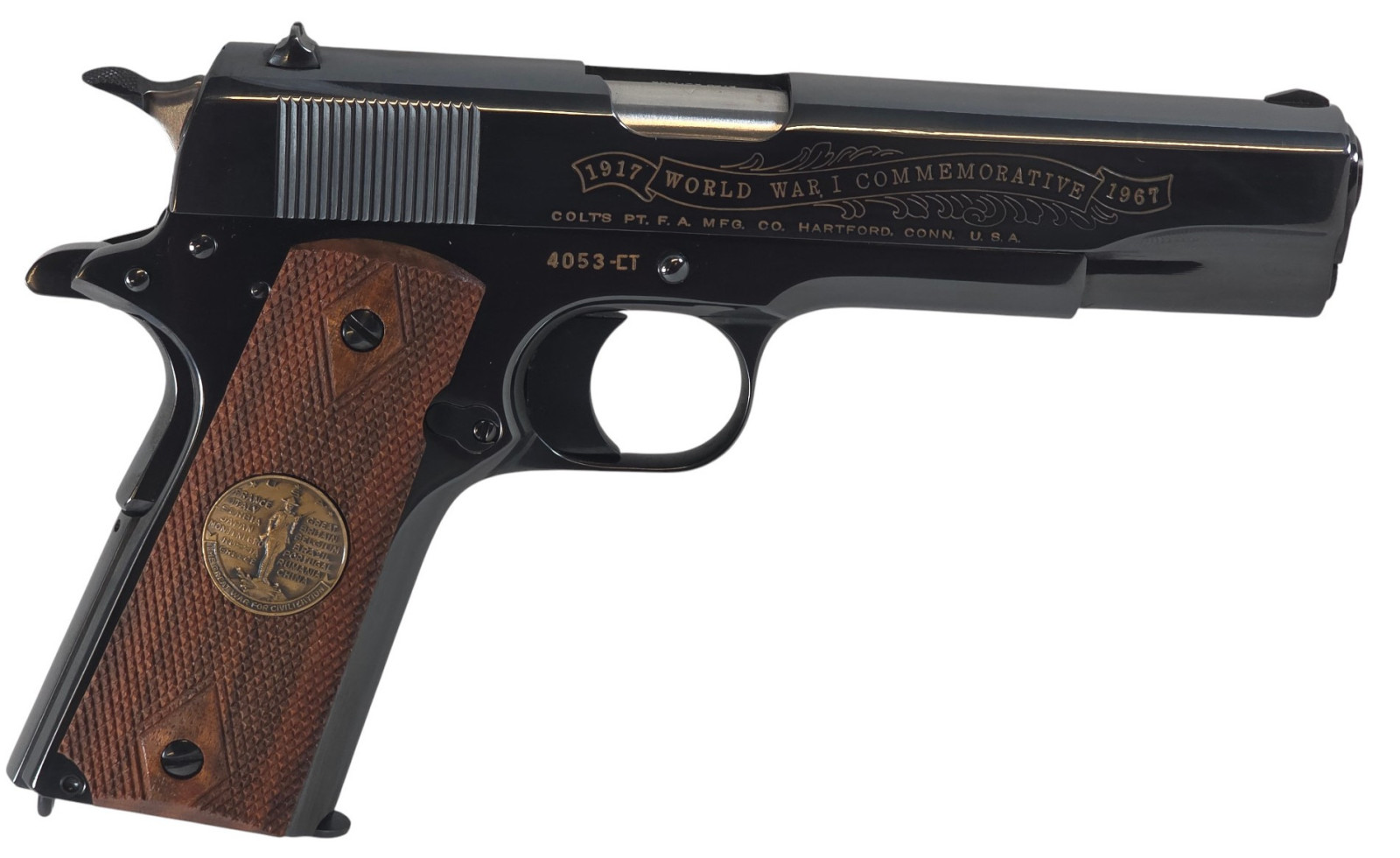 Hergestellt von Colt im Jahr 1967 als eine der Gedenkpistolen des Modells 1911 zum Ersten Weltkrieg. Ähnlich den 1911er-Modellen des Ersten Weltkriegs verfügt diese Pistole über einen 5-Zoll-Lauf mit flacher offener Visierung. Sie ist in Colt Royal Blue brüniert. Die linke Seite des Verschlusses ist goldfarben graviert und zeigt eine Schlachtszene mit amerikanischen Soldaten, die auf die Deutschen im Chateau Thierry feuern. Das Colt-Logo befindet sich am hinteren Ende des Verschlusses. Die rechte Seite ist ebenfalls goldfarben graviert und trägt die Aufschrift „1917 / WORLD WAR I COMMEMORATIVE / 1967“ mit der einzeiligen Colt-Adresse darunter. Die goldfarbene Seriennummer ist unten auf dem Rahmen eingeprägt. Der Colt-VP-Beschussstempel befindet sich am Auswurffenster des Laufs. Die Pistole ist halbautomatisch und verfügt über eine Griffsicherung und eine manuelle Daumensicherung. Sie ist mit Griffschalen mit Bronzemedaillons ausgestattet. Das runde Medaillon auf der linken Seite zeigt einen Adler mit der Aufschrift „1917-1918 / WORLD WAR“, das rechteckige Medaillon trägt die Aufschrift „Chateau Thierry“. Das Bronzemedaillon auf der rechten Seite zeigt einen US-Soldaten mit einer Liste der alliierten Länder. Die Pistole ist mit einer Fangriemenöse ausgestattet und wird mit einem 7-Schuss-Magazin im Originalkarton geliefert.
