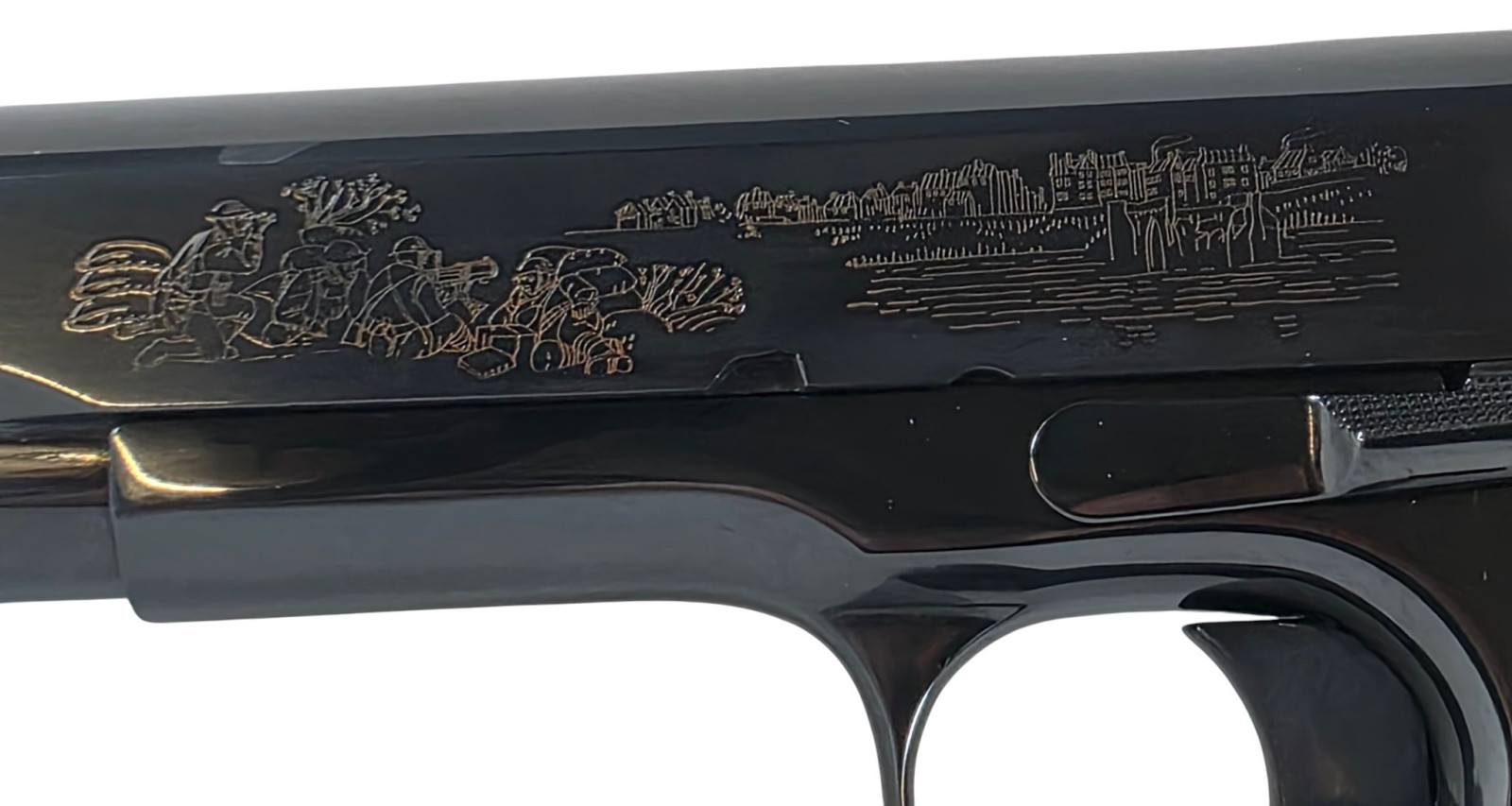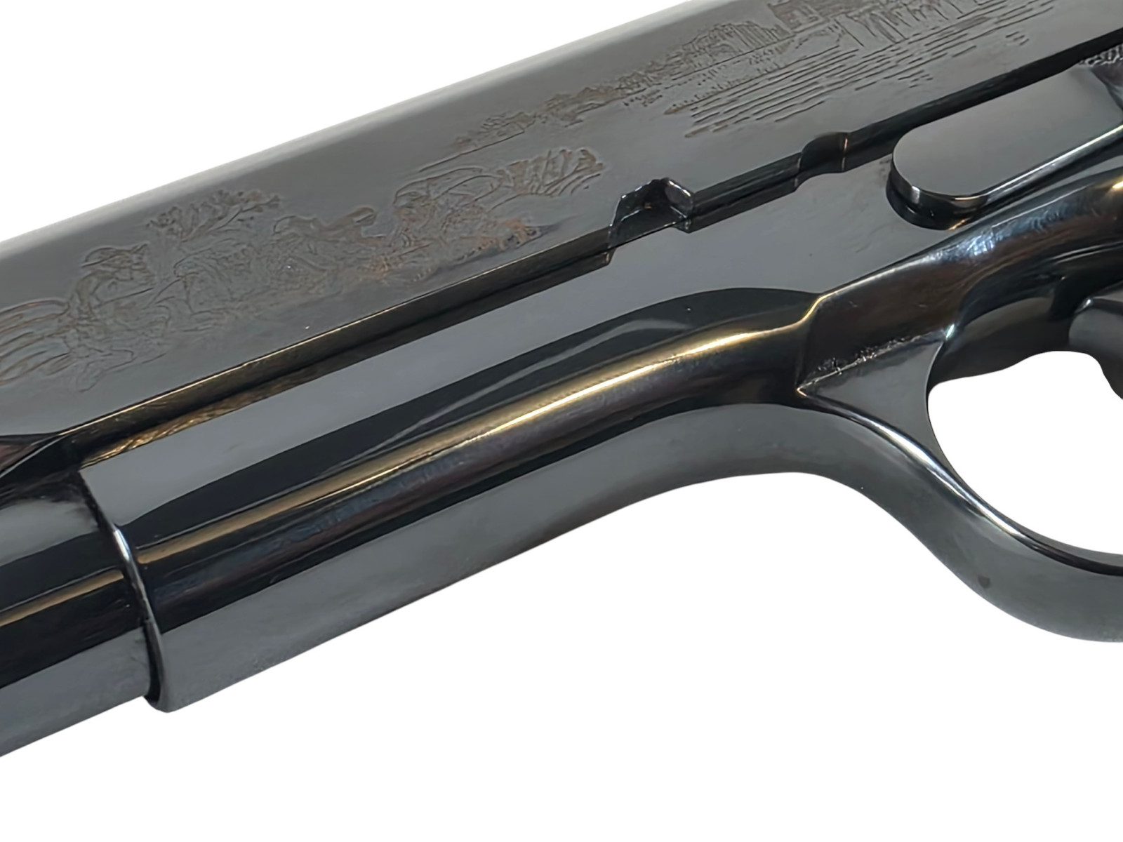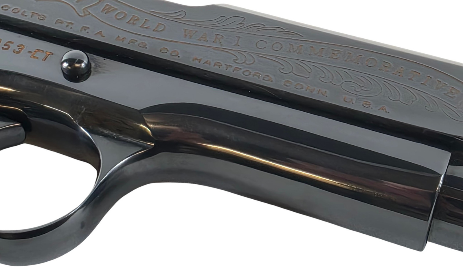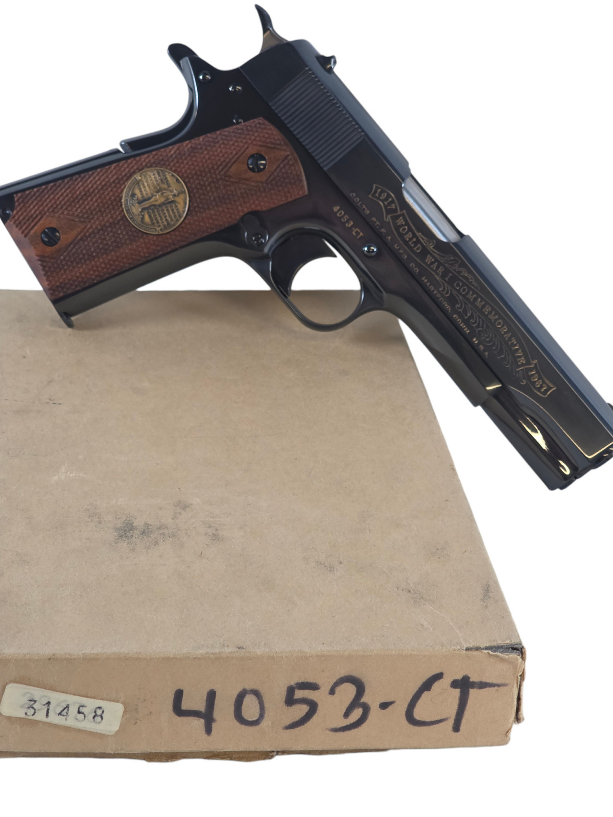 Hergestellt von Colt im Jahr 1967 als eine der Gedenkpistolen des Modells 1911 zum Ersten Weltkrieg. Ähnlich den 1911er-Modellen des Ersten Weltkriegs verfügt diese Pistole über einen 5-Zoll-Lauf mit flacher offener Visierung. Sie ist in Colt Royal Blue brüniert. Die linke Seite des Verschlusses ist goldfarben graviert und zeigt eine Schlachtszene mit amerikanischen Soldaten, die auf die Deutschen im Chateau Thierry feuern. Das Colt-Logo befindet sich am hinteren Ende des Verschlusses. Die rechte Seite ist ebenfalls goldfarben graviert und trägt die Aufschrift „1917 / WORLD WAR I COMMEMORATIVE / 1967“ mit der einzeiligen Colt-Adresse darunter. Die goldfarbene Seriennummer ist unten auf dem Rahmen eingeprägt. Der Colt-VP-Beschussstempel befindet sich am Auswurffenster des Laufs. Die Pistole ist halbautomatisch und verfügt über eine Griffsicherung und eine manuelle Daumensicherung. Sie ist mit Griffschalen mit Bronzemedaillons ausgestattet. Das runde Medaillon auf der linken Seite zeigt einen Adler mit der Aufschrift „1917-1918 / WORLD WAR“, das rechteckige Medaillon trägt die Aufschrift „Chateau Thierry“. Das Bronzemedaillon auf der rechten Seite zeigt einen US-Soldaten mit einer Liste der alliierten Länder. Die Pistole ist mit einer Fangriemenöse ausgestattet und wird mit einem 7-Schuss-Magazin im Originalkarton geliefert.