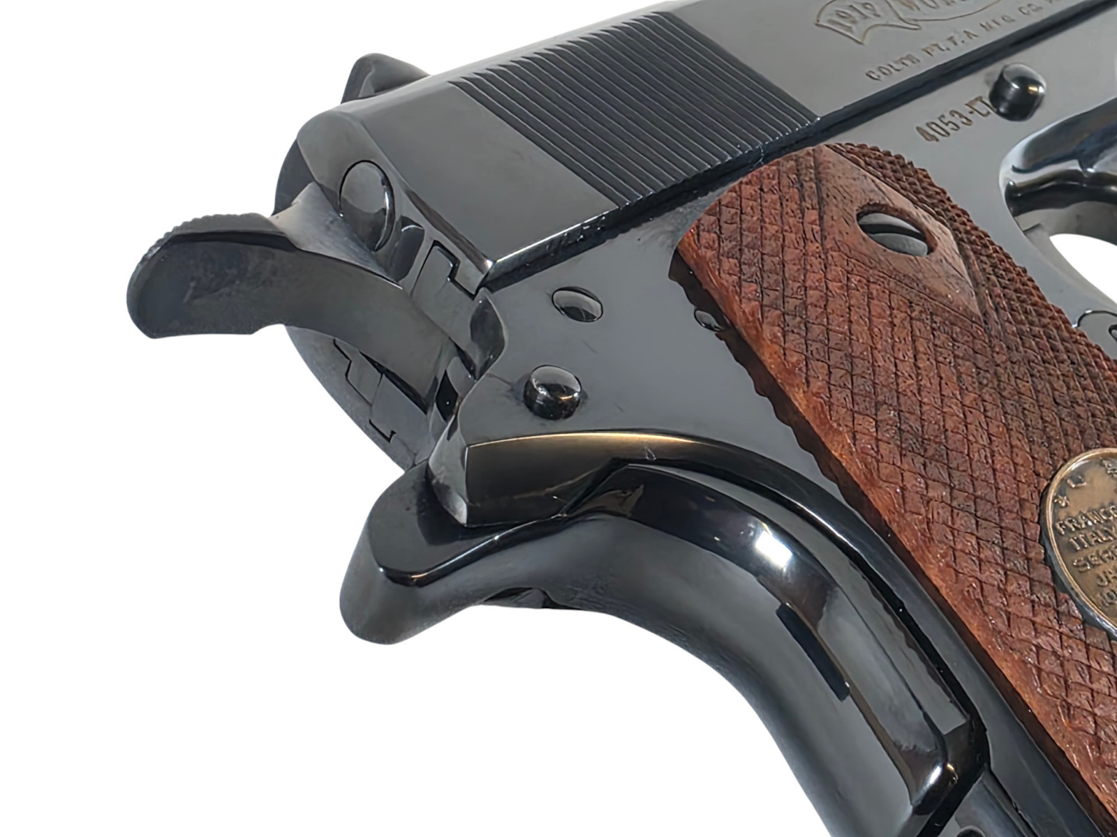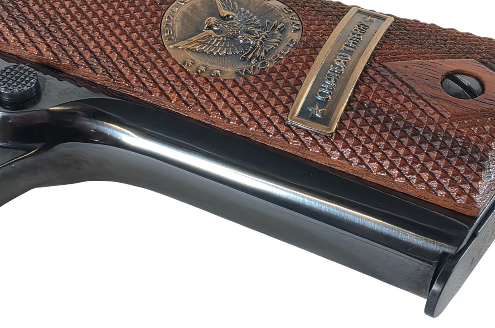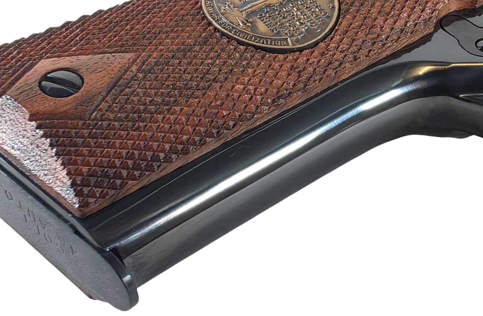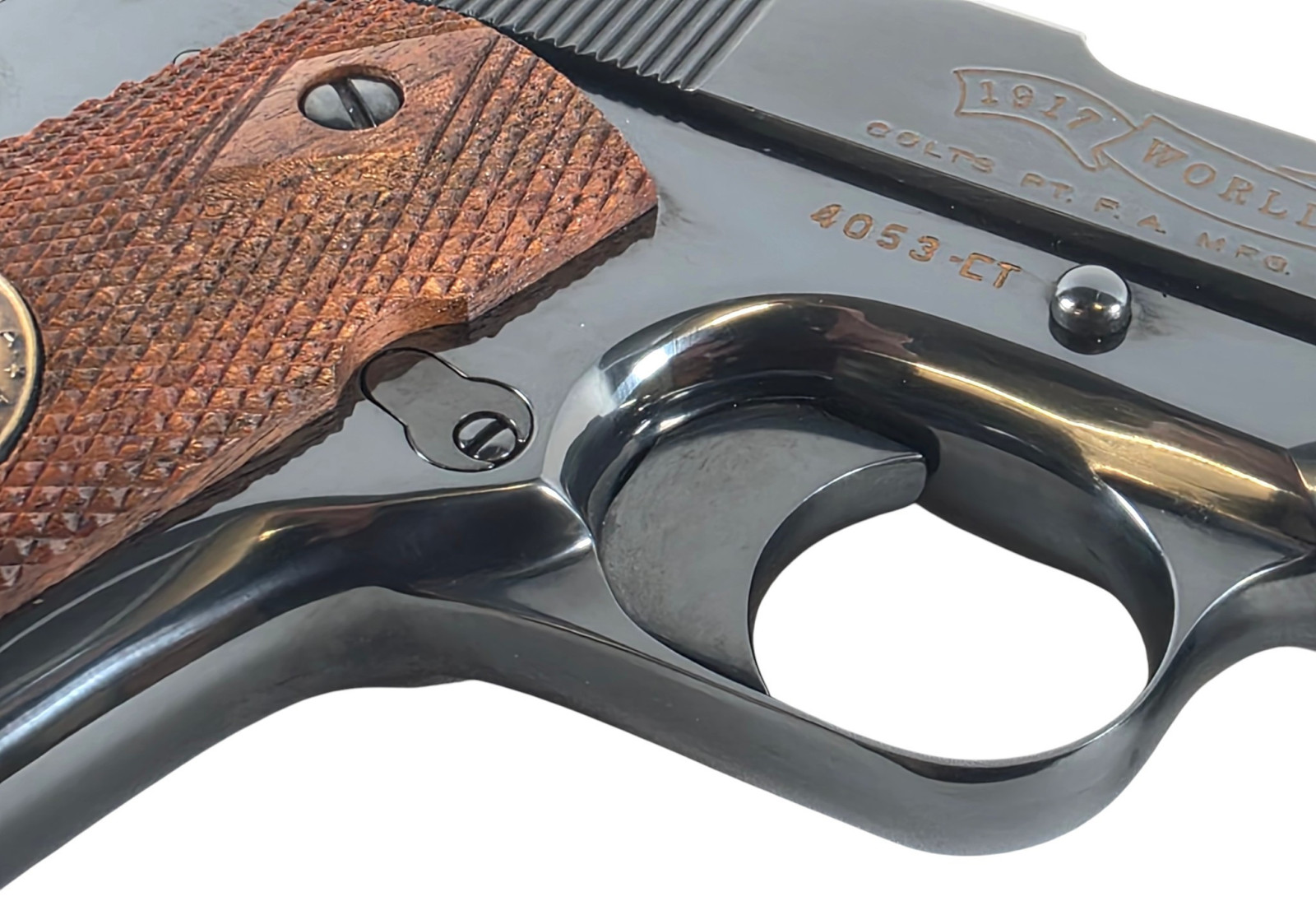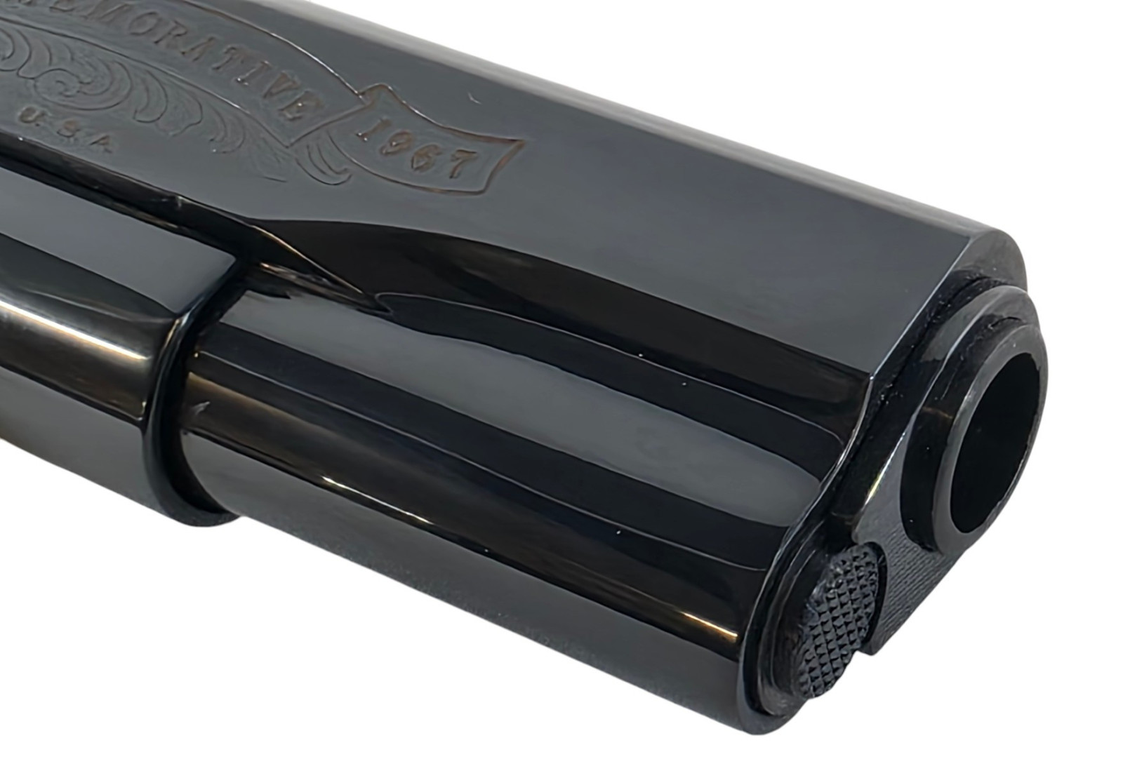 Hergestellt von Colt im Jahr 1967 als eine der Gedenkpistolen des Modells 1911 zum Ersten Weltkrieg. Ähnlich den 1911er-Modellen des Ersten Weltkriegs verfügt diese Pistole über einen 5-Zoll-Lauf mit flacher offener Visierung. Sie ist in Colt Royal Blue brüniert. Die linke Seite des Verschlusses ist goldfarben graviert und zeigt eine Schlachtszene mit amerikanischen Soldaten, die auf die Deutschen im Chateau Thierry feuern. Das Colt-Logo befindet sich am hinteren Ende des Verschlusses. Die rechte Seite ist ebenfalls goldfarben graviert und trägt die Aufschrift „1917 / WORLD WAR I COMMEMORATIVE / 1967“ mit der einzeiligen Colt-Adresse darunter. Die goldfarbene Seriennummer ist unten auf dem Rahmen eingeprägt. Der Colt-VP-Beschussstempel befindet sich am Auswurffenster des Laufs. Die Pistole ist halbautomatisch und verfügt über eine Griffsicherung und eine manuelle Daumensicherung. Sie ist mit Griffschalen mit Bronzemedaillons ausgestattet. Das runde Medaillon auf der linken Seite zeigt einen Adler mit der Aufschrift „1917-1918 / WORLD WAR“, das rechteckige Medaillon trägt die Aufschrift „Chateau Thierry“. Das Bronzemedaillon auf der rechten Seite zeigt einen US-Soldaten mit einer Liste der alliierten Länder. Die Pistole ist mit einer Fangriemenöse ausgestattet und wird mit einem 7-Schuss-Magazin im Originalkarton geliefert.