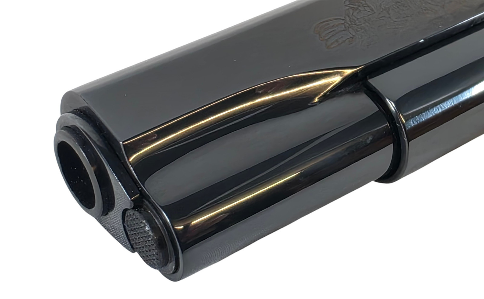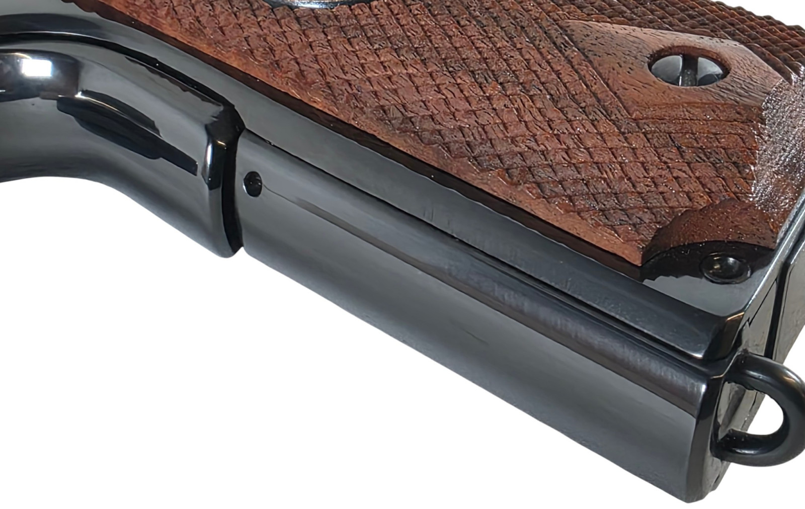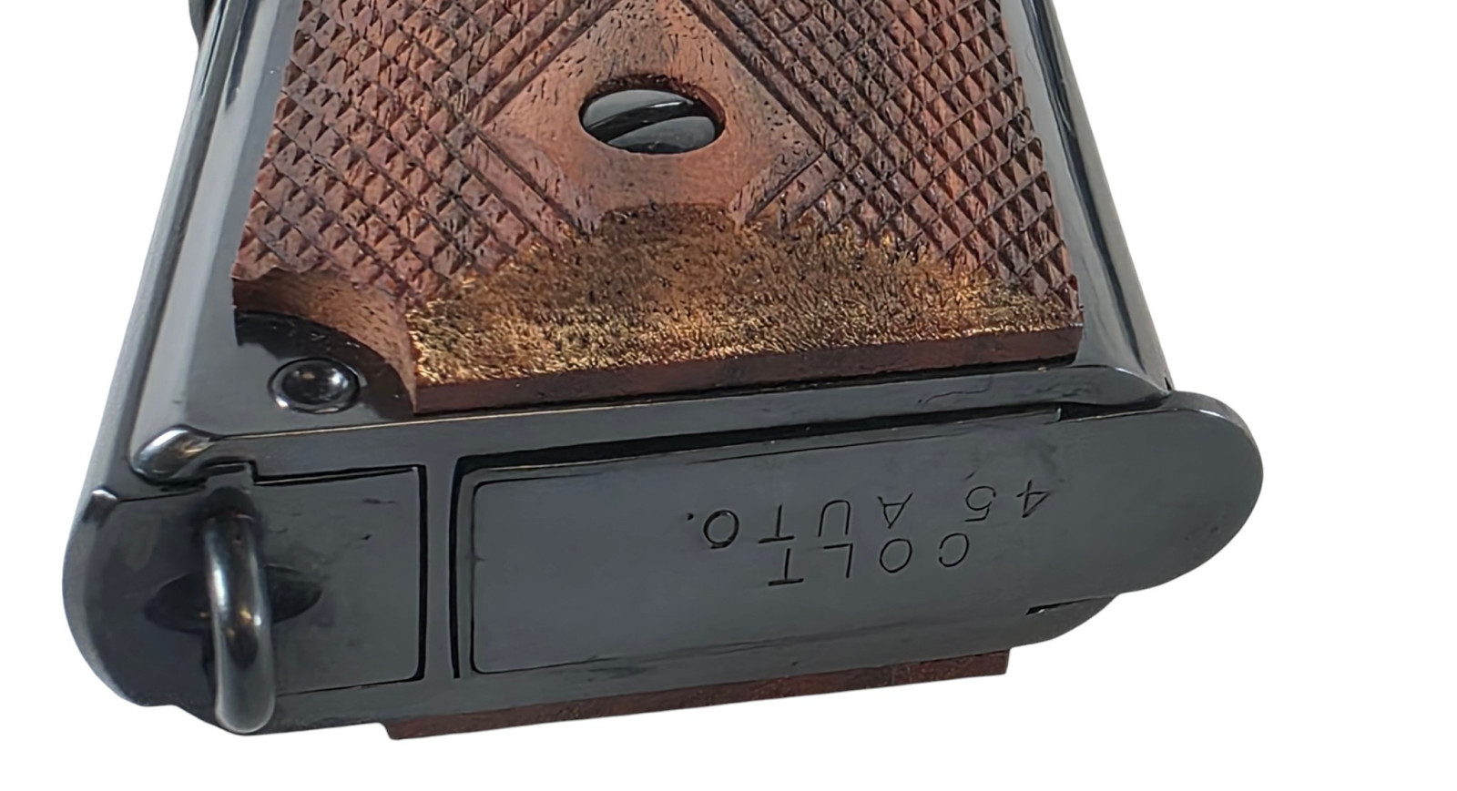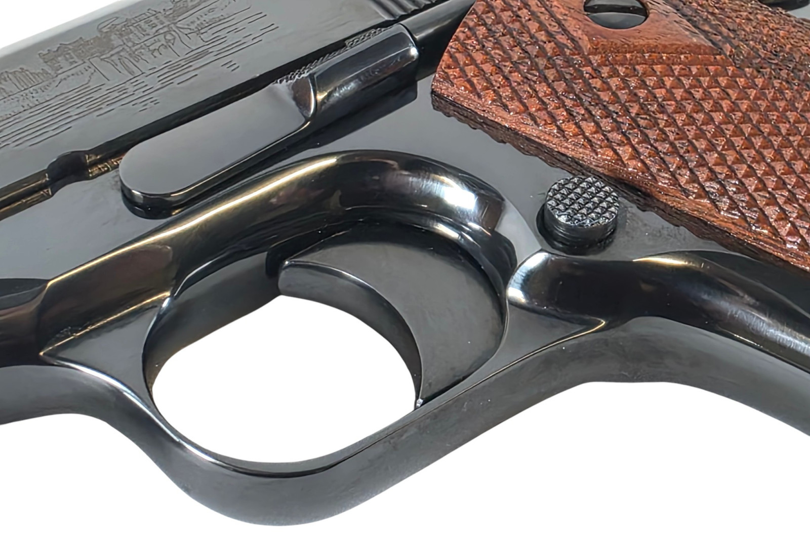 Hergestellt von Colt im Jahr 1967 als eine der Gedenkpistolen des Modells 1911 zum Ersten Weltkrieg. Ähnlich den 1911er-Modellen des Ersten Weltkriegs verfügt diese Pistole über einen 5-Zoll-Lauf mit flacher offener Visierung. Sie ist in Colt Royal Blue brüniert. Die linke Seite des Verschlusses ist goldfarben graviert und zeigt eine Schlachtszene mit amerikanischen Soldaten, die auf die Deutschen im Chateau Thierry feuern. Das Colt-Logo befindet sich am hinteren Ende des Verschlusses. Die rechte Seite ist ebenfalls goldfarben graviert und trägt die Aufschrift „1917 / WORLD WAR I COMMEMORATIVE / 1967“ mit der einzeiligen Colt-Adresse darunter. Die goldfarbene Seriennummer ist unten auf dem Rahmen eingeprägt. Der Colt-VP-Beschussstempel befindet sich am Auswurffenster des Laufs. Die Pistole ist halbautomatisch und verfügt über eine Griffsicherung und eine manuelle Daumensicherung. Sie ist mit Griffschalen mit Bronzemedaillons ausgestattet. Das runde Medaillon auf der linken Seite zeigt einen Adler mit der Aufschrift „1917-1918 / WORLD WAR“, das rechteckige Medaillon trägt die Aufschrift „Chateau Thierry“. Das Bronzemedaillon auf der rechten Seite zeigt einen US-Soldaten mit einer Liste der alliierten Länder. Die Pistole ist mit einer Fangriemenöse ausgestattet und wird mit einem 7-Schuss-Magazin im Originalkarton geliefert.