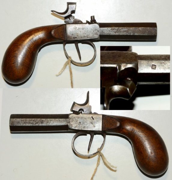 Französisches Perkussionsterzerol um 1860, eingeschlagene Marke ein "M" oder "W", Lauflänge 62mm, Gesamtlänge 16,6 cm, Kaliber 10,6mm, dickwandiger Achtkantlauf, technisch völlig in Ordnung, Alters und Gebrauchsspuren ohne Mängel