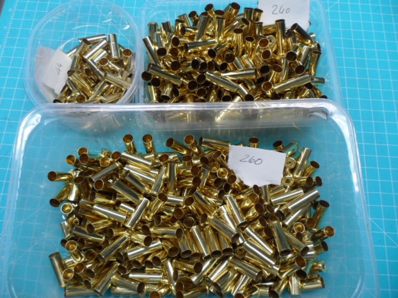 Die Hülsen wurden einmal abgeschossen und nicht wiedergeladen. Sie wurden mit einer ADM Decappingmaschine entzündert un anschließend nass gereinigt. Es sind 240 St. Fiocchi 357 Mag Hülsen, 260 St. Fiocchi 38 Spez. Hülsen und 44 St Winchester 38 Spez. Hülsen.