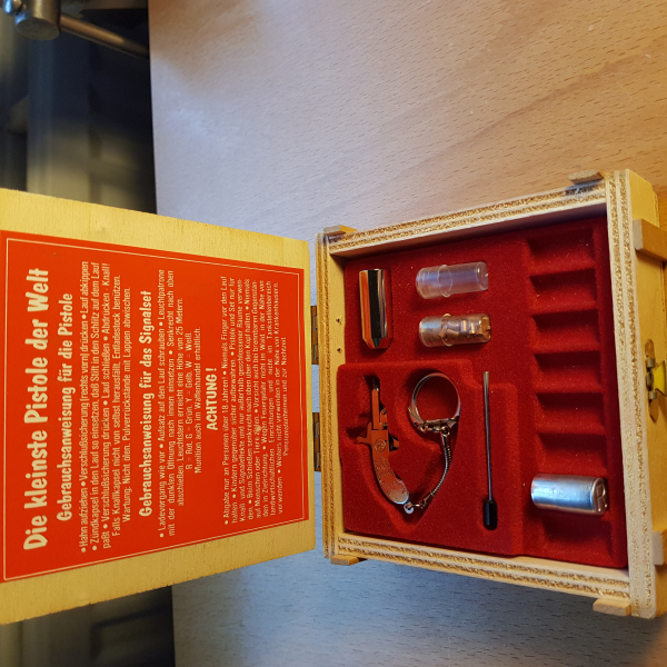 Sie bieten auf eine Berloque, die kleinste Pistole der Welt, Kaliber 2mm Stiftfeuer, Neuwertiger Zustand, wahrscheinlich ungeschoßen, im Kasten. Leider sind neben der Pistole nur noch der aufschraubbare Abschußbecher, ein Ausstoßer, eine Kapsel mit Patronen, eine leere Kapsel und eine Leuchtpatrone R vorhanden, auf der Pistole ist ein PTB 222 Stempel, d.h. freier Erwerb ab 18. Jahren. Privatverkauf zu den hier üblichen Bedingungen.