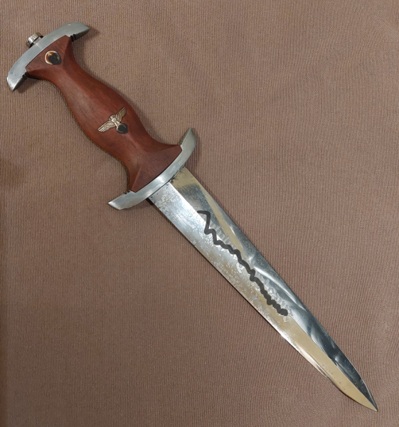 Angeboten wird ein SA-Dienstdolch mit Herstellerstempel RZM M7/13, der für die Firma „Schüttelhöfer Artur & Co. Solingen“ steht, in gutem Zustand. Die Klinge ist leicht fleckig. Die Devise ist sehr schön erhalten und gut fühlbar. Gesamtlänge ca. 35cm. Der Verkauf erfolgt unter Ausschluss jeglicher Gewährleistung. Der Ausschluss gilt nicht für Schadenersatzansprüche aus grob fahrlässiger bzw. vorsätzlicher Verletzung von Pflichten des Verkäufers sowie für jede Verletzung von Leben, Körper und Gesundheit.