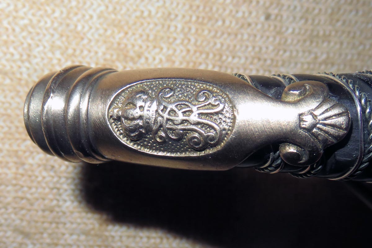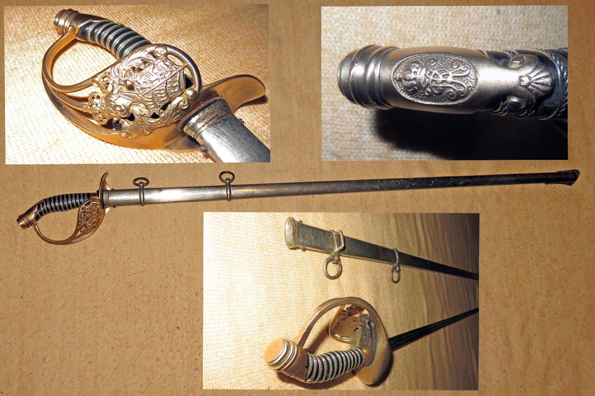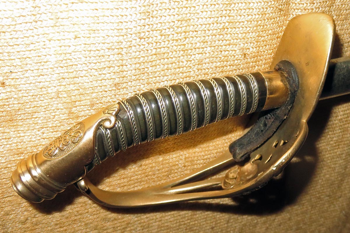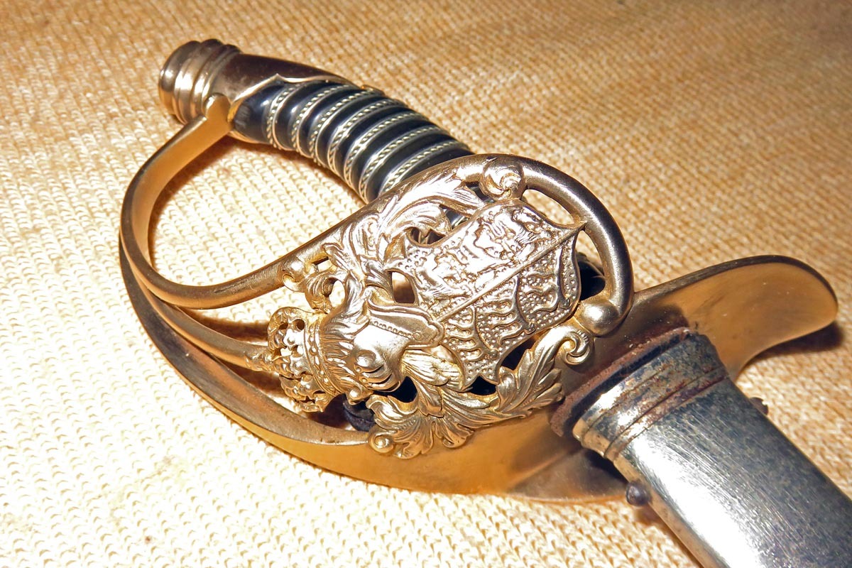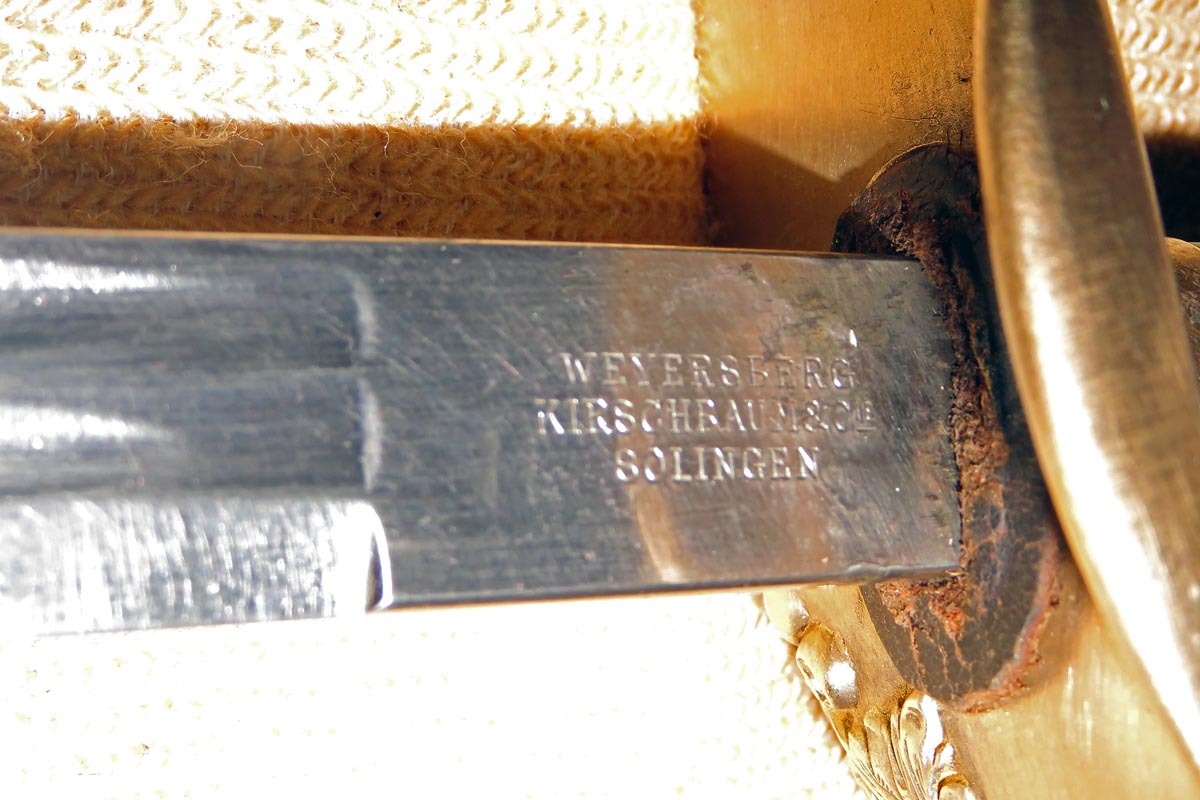 Das Messingbügelgefäß ist mit Wappen, originaler Fingerschlaufe und hat einen dunklen Griff, wobei die Griffwicklung erneuert ist.