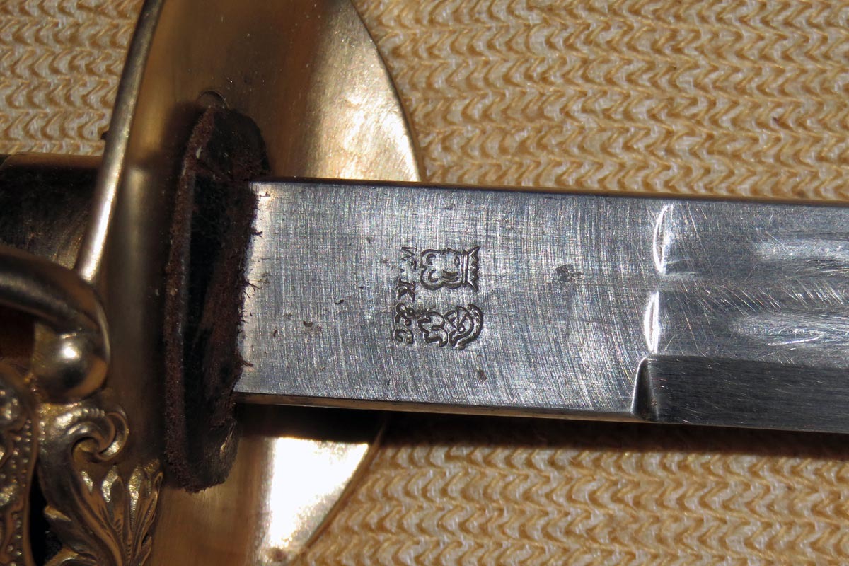 Die vernickelte Klinge ist an der Spitze leicht angeschliffen und hat auf der Fehlschärfe beidseitige Herstellermarken.