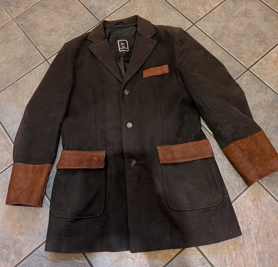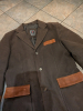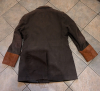 verkaufe: ein Old Time Jacket/Coat - Größe XL (Schulterbreite ca. 52 cm, einfache Breite über die Brust im geschlossenen Zustand ca. 56 cm, Gesamtlänge ca. 87 cm, Ärmellänge ab Schulternaht ca. 65 cm) - umgearbeitet aus einem zivilen Mantel - festes dunkelbraunes canvasartiges Gewebe, Ärmel und Taschen wurden mit Rauleder abgesetzt, Hornknöpfe - getragen mit Tragespuren (Siehe Fotos), schöner authentischer Look