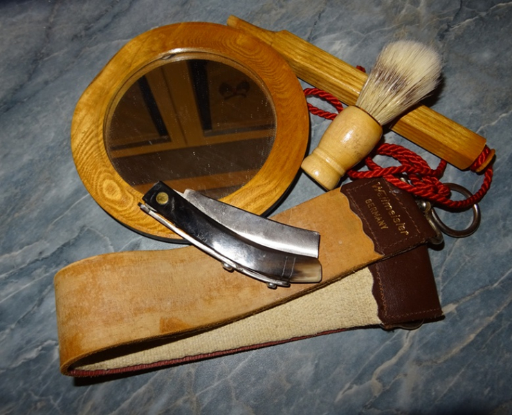 verkaufe: ein Konvolut fürs Lagerleben/Westernhobby für die gepflegte Rasur bestehend aus dem Nachbau eines alten Rasiermessers aus der Zeit des Civil War (unbenutzt, neuwertig), einem Streichriemen (unbenutzt, neuwertig), einem Rasierpinsel (unbenutzt, neuwertig) und einem Handspiegel mit Holzrahmen und abnehmbaren Holzgriff (sehr guter gebrauchter Zustand)