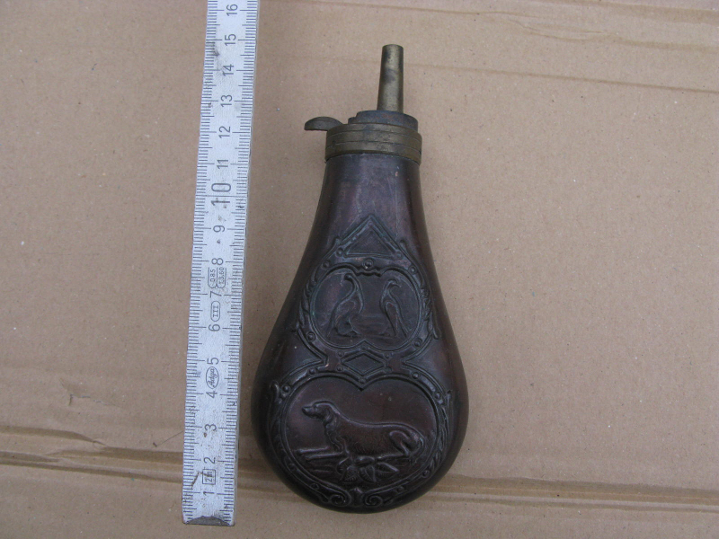Hier biete ich aus den Beständen eines Schützenkameraden, der sich aus dem aktiven Schießsport zurückzieht, diese Pulverflasche an. Im Internet habe ich sie unter dem Namen Remington Pattern Copper gefunden. Vielleicht ein nettes Accessoire für einen Vorderladerrevolver. Zustand siehe Bilder.