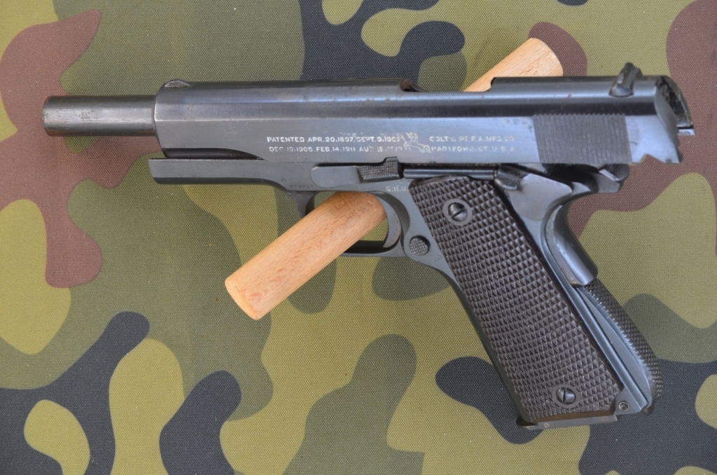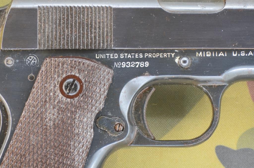 Herstellerschriftzug („COLT`S PT. MFG. CO., Hartford, CT., USA“), Colt-Logo (Pferd), Seriennummer "No. 932789", Kaliberangabe ".45 AUTO", gültiger deutscher Beschuss von 1969, Modellbezeichnung „M 1911 A 1“, Armee-Eigentumsstempel „UNITED STATES PROPERTY“ und "U.S. ARMY", Patenthinweise "PATENTED APR. 20, 1897 SEPT.9, 1902 DEC. 19, 1905 FEB. 14, 1911 AUG.9, 1913". "G.H.D." = Initialen des Abnahmeinspektors Brigadegeneral Guy H. Drewry; kleines Importeurzeichen "Brigant". Auf dem Lauf auf dem Patronenlager "CAL. 45 A". Rechts unterhalb vom Magazinauslöseknopf sowie oben auf dem Schlitten vor der Kimme ein großes "P". Alle Beschriftungen sind sehr gut lesbar!