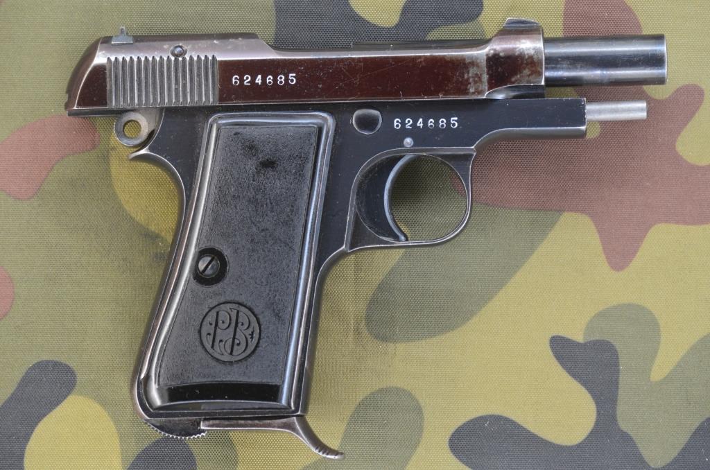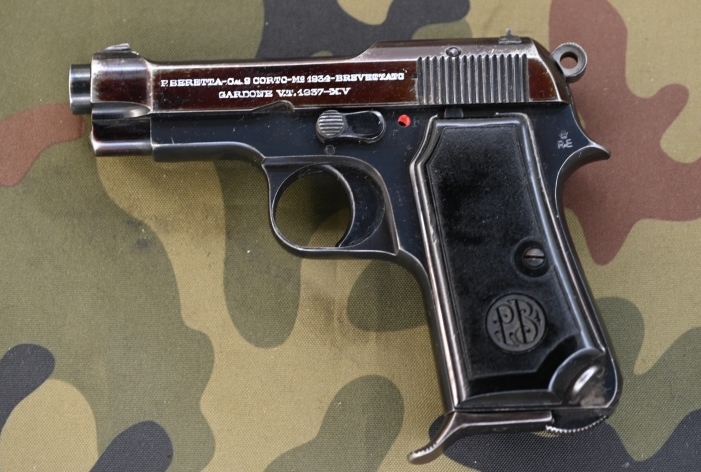 Kaliberangabe, Herstellerbezeichnung „P. BERETTA", Patenthinweis "Brevettato Gardone V.T. 1937-XV". Kaliberangabe „CAL. 9 CORTO“, Modellbezeichnung „Mo 1934“, Seriennummer „624685“. Diverse alte gültige italienische Beschusszeichen (Krone über "RE“), verschnörkeltes Logo „P B“ auf beiden Griffschalen.
