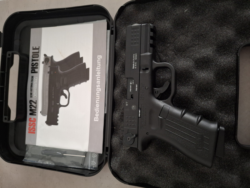 Verkaufe aus meiner Sammlung eine ungeschossene ISSC M22 made in Austria in Top Zustand.Es handelt sich um die überarbeitete Version. Gekauft 2021 neu beim Händler. Die Pistole ist so bei den Händlern nicht mehr zu kaufen. PTB 940 !