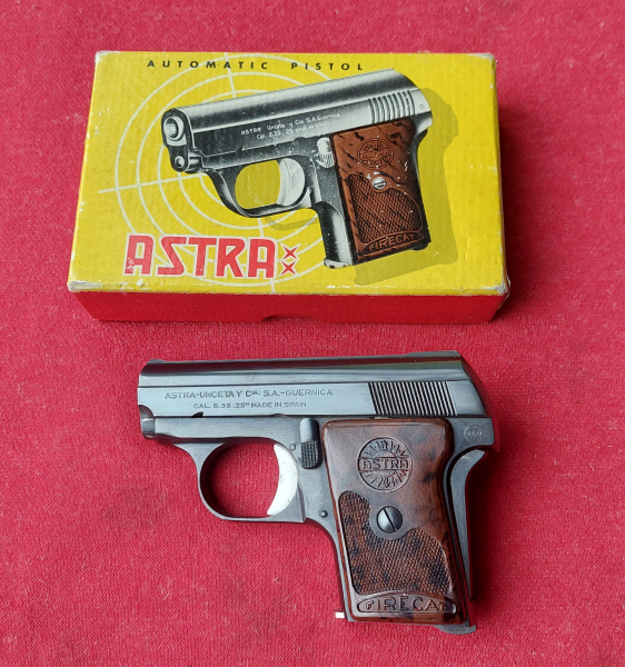Halbautomatische Pistole von "Astra" - Mod. Firecat / Kal.: 6,35mm Browning / guter Gesamtzustand mit wenig oberflächigen Spuren / das System funktioniert gut / das Magazin und die Originalverpackung sind dabei