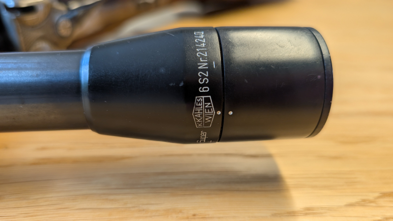 Zustand Zielfernrohr: Kahles Helia 6× — gebraucht, funktionstüchtig, sichtbare Altersspuren am Gehäuse (siehe Foto mit Gravur „KAHLES WIEN …“). Optik funktionsfähig.