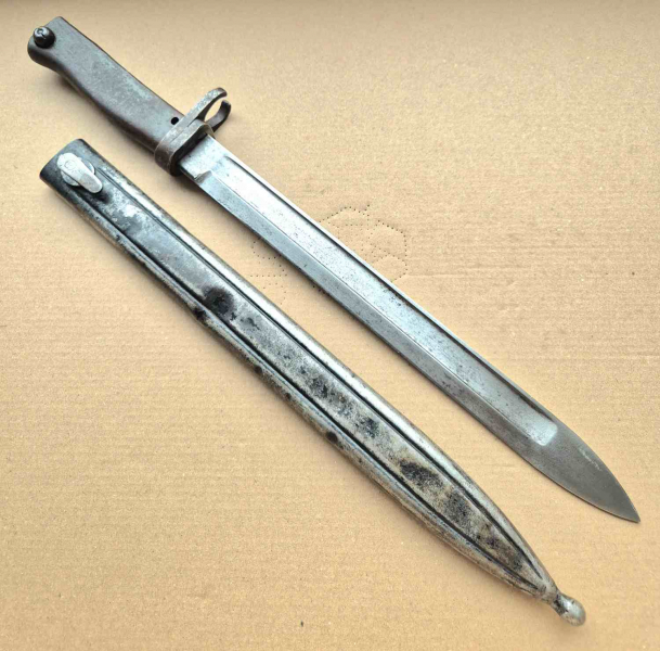 Deutsches Notbajonett (EB 6) aus dem 1.Weltkrieg mit passender Scheide. Dieses Modell mit einer Bayard-Klinge taucht nicht sehr oft auf dem Markt auf und dürfte in den meisten Sammlungen fehlen. Es gibt eine kleine Verbiegung über dem Sperrriegel, was aber seine Funktion nicht beeinträchtigt Zustand siehe Bilder, bei Fragen einfach melden. Versand in restliche EU 20,00Euro