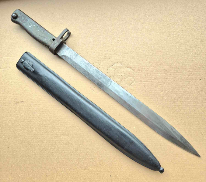 Deutsches Notbajonett (EB 5) aus dem 1.Weltkrieg mit passender Scheide. Das Stück ist unberührt und der Griff besitzt noch mindestens 50% der Originalen Farbe. Die Scheide wurde evtl. mal überstrichen. Zustand siehe Bilder, bei Fragen einfach melden. Versand in restliche EU 20,00Euro