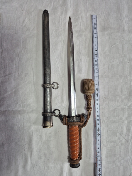 Verkaufe , aus dem Nachlass meines Vaters, diesen Heeresoffiziers-Dolch. Mit Scheide, Portepee,Hersteller WKC Solingen.leider entnazifiziert. Gravur R B. (Den Träger dieses Dolches habe ich als Kind noch persönlich kennen gelernt -Renne B. )