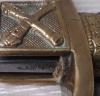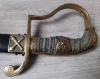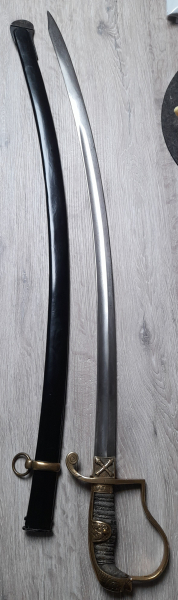 Klinge mit Pandurenspitze, beiderseits mit Hohlbahn, auf dem Rücken mit Abnahmepunze "Krone W 88", darunter Kontrollpunze, Hersteller "Robert Hermes Solingen", schweres Messinggefäß mit Löwenkopf, rechteckige Parierlappen, terzseitig mit gekreuzten Kanonenrohren, Rochenhautgriff mit Drahtwicklung, diverse Kontrollpunzen, schwarz lackierte Stahlscheide.