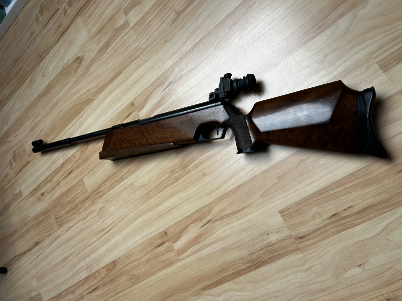 Angeboten wird eine schöne Feinwerkbau 300 S mit Rechtsschaft und neuem Dichtungssatz. Das Gewehr hat ein Adlerauge und einen Diopteraufsatz montiert und trifft noch immer einwandfrei.