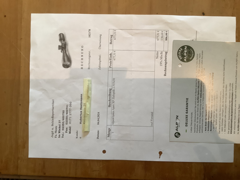 Das ZF wurde erst im April 2024 von mir neu erworben und aufgrund einer Lieferverzögerung der dafür bestimmten Waffe (cal. 223) erst im Oktober 2024 montiert, eingeschossen und ist seitdem ungenutzt (hatte mir aufgrund der Liefertverzögerung zwischenzeitlich bereits eine andere Waffe samt ZF zugelegt).