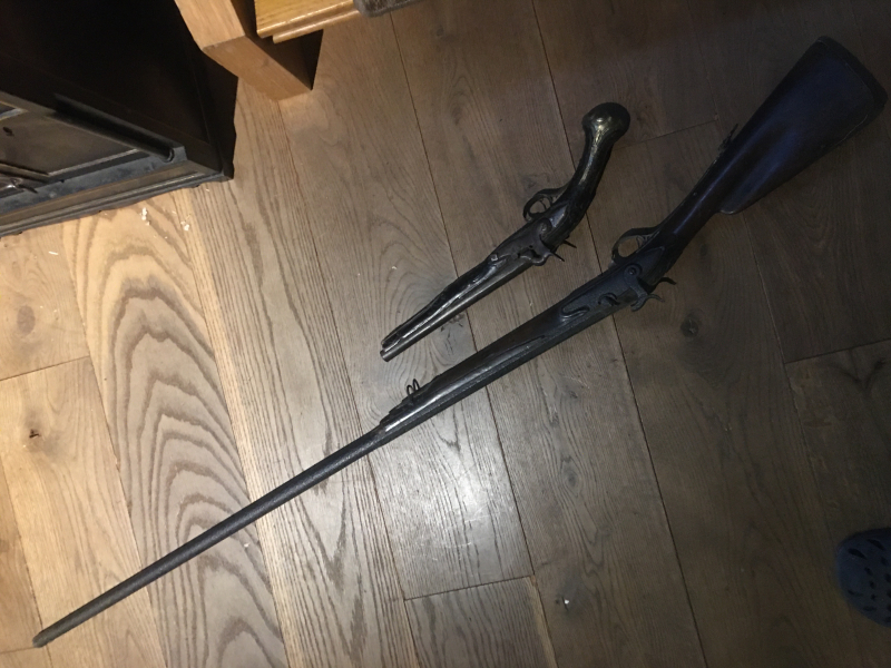 Die Pistole ist umgeändert von Steinschloss auf Perkussion. Das Schloss funktioniert, es lässt sich spannen und abschlagen.