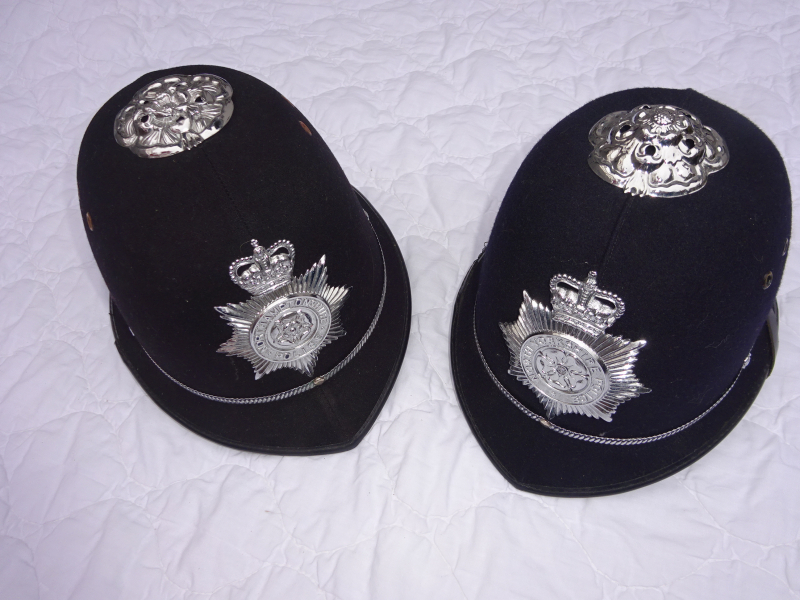 Ein Helm ist von der North Yorkshire Police , der andere von Northamptonshire Police