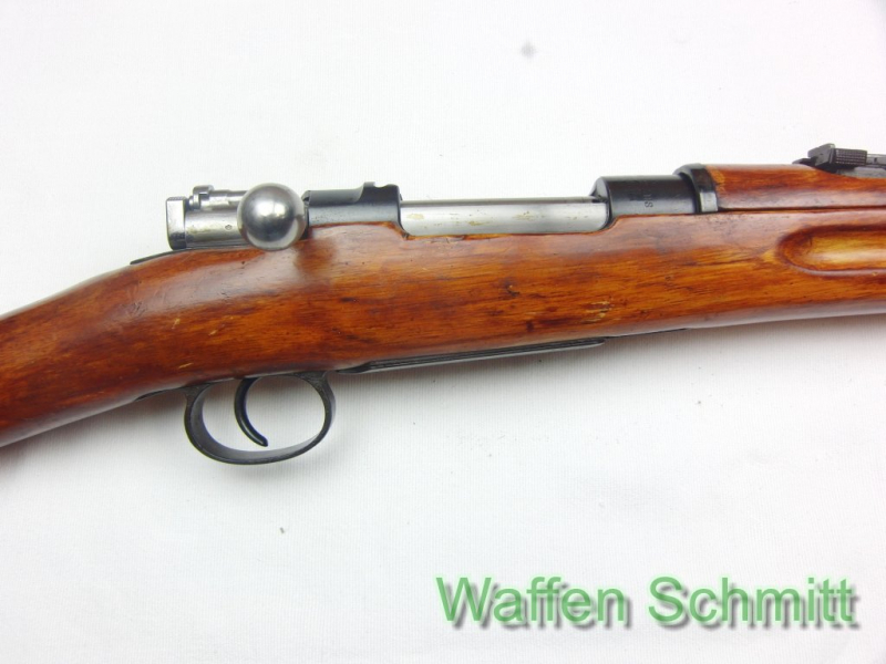 Sie bieten auf ein Ordonanzgewehr (Repetierbüchse), Carl Gustafs 95 1900 im Kaliber 6,5x55SE. 74cm Lauflänge mit verstellbarer Visierung (Lauf von innen ohne Mängel), Flügelsicherung, gerader Kammerstengel, 5-Schuß Magazin von oben zu laden, Druckpunktabzug, lackierter Nußbaumholzschaft mit Handschutz und Stahlschaftkappe und Putzstock, Riemenbügel, Schaftlänge 35,5cm, Gesamtlänge 126cm. Guter Zustand!!!