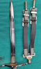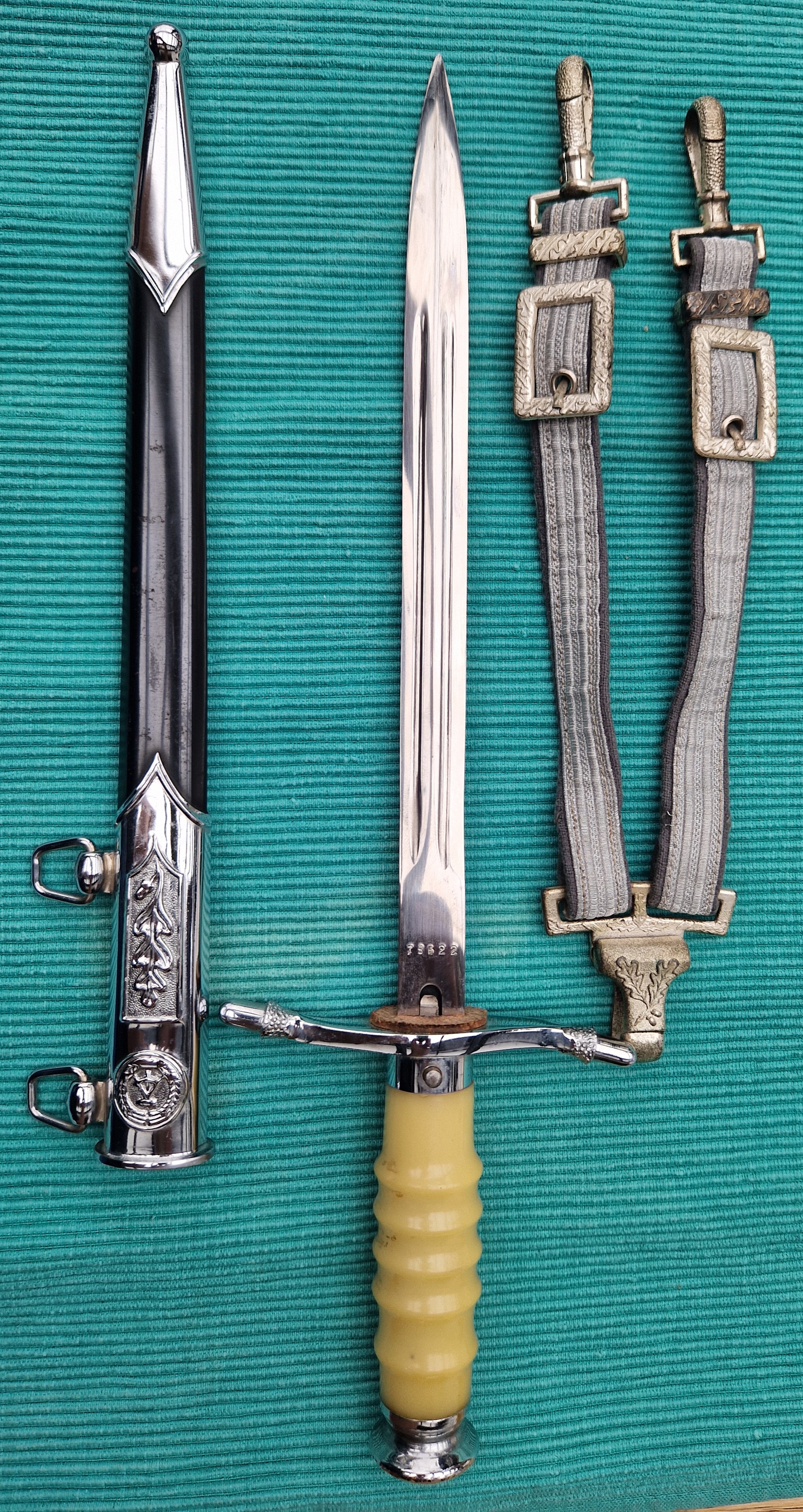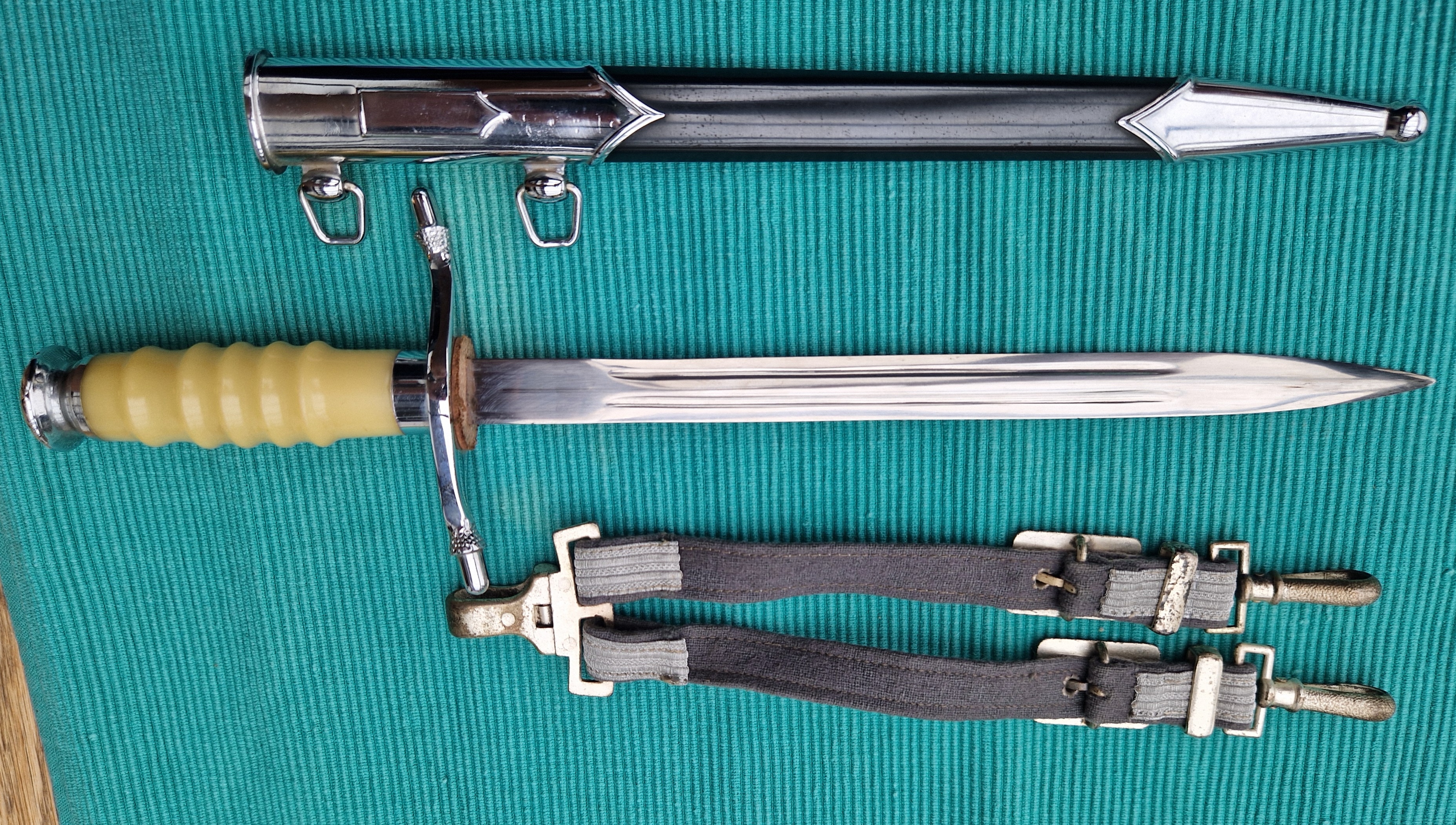 weißer Kunststoffgriff, verchromte Beschläge, brünierter Scheidenkorpus, mit Gehänge.