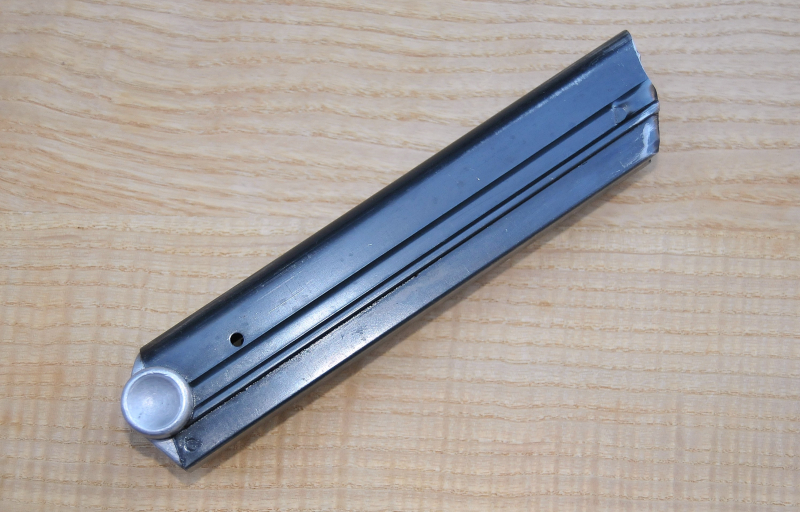Brüniertes Stahlblechmagazin mit Alu-Boden und originaler Waffennummer (9738 x) und Abnahme Adler/655. Die Brünierung ist bis auf einen fleckigen Brünierungsverlust in Magazinmitte vorne rechts komplett einwandfrei mit nur geringen Tragespuren.
