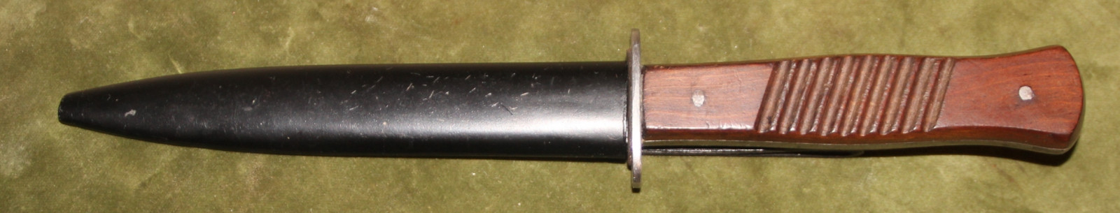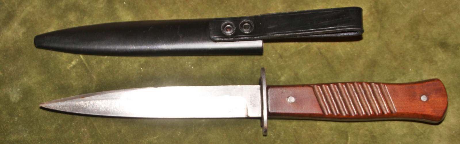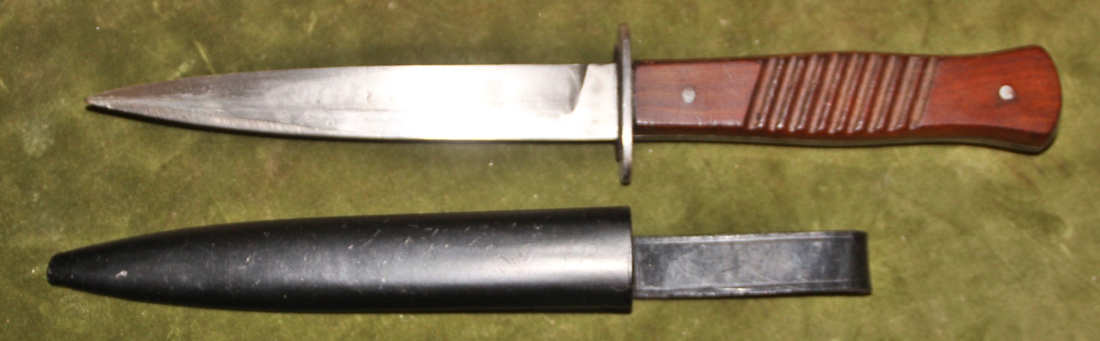 Deutscher Grabendolch, 1.Weltkrieg, mit Scheide, Replik ??. Etwa um die Jahrtausendwende wurden bis ins Detail originalgetreue Hammesfahr-Dolche in sehr guter Qualität nachgemacht und im Fachhandel verkauft. Eventuell handelt es sich hier um ein solches Stück. Einschneidige, gerade Klinge mit halber Rückenschärfe und Mittelspitze, gerades, flaches ovales Parierstück, zweifach vernietetes, symmetrisches Griffstück mit schräg gerippten Holzgriffschalen, die Klinge mit Gebrauchspuren, oberflächliche Schleifspuren vom Schärfen, am Griff oder der Scheide jedoch keinerlei Gebrauchspuren erkennbar. Diese vorhandenen bzw. nicht vorhandenen Gebrauchspuren könnten ein Indiz für eine Fälschungsabsicht sein. Denn: Entweder Gebrauchspuren auf allen Bestandteilen oder alle Teile fabrikfrisch ohne Gebrauchspuren.