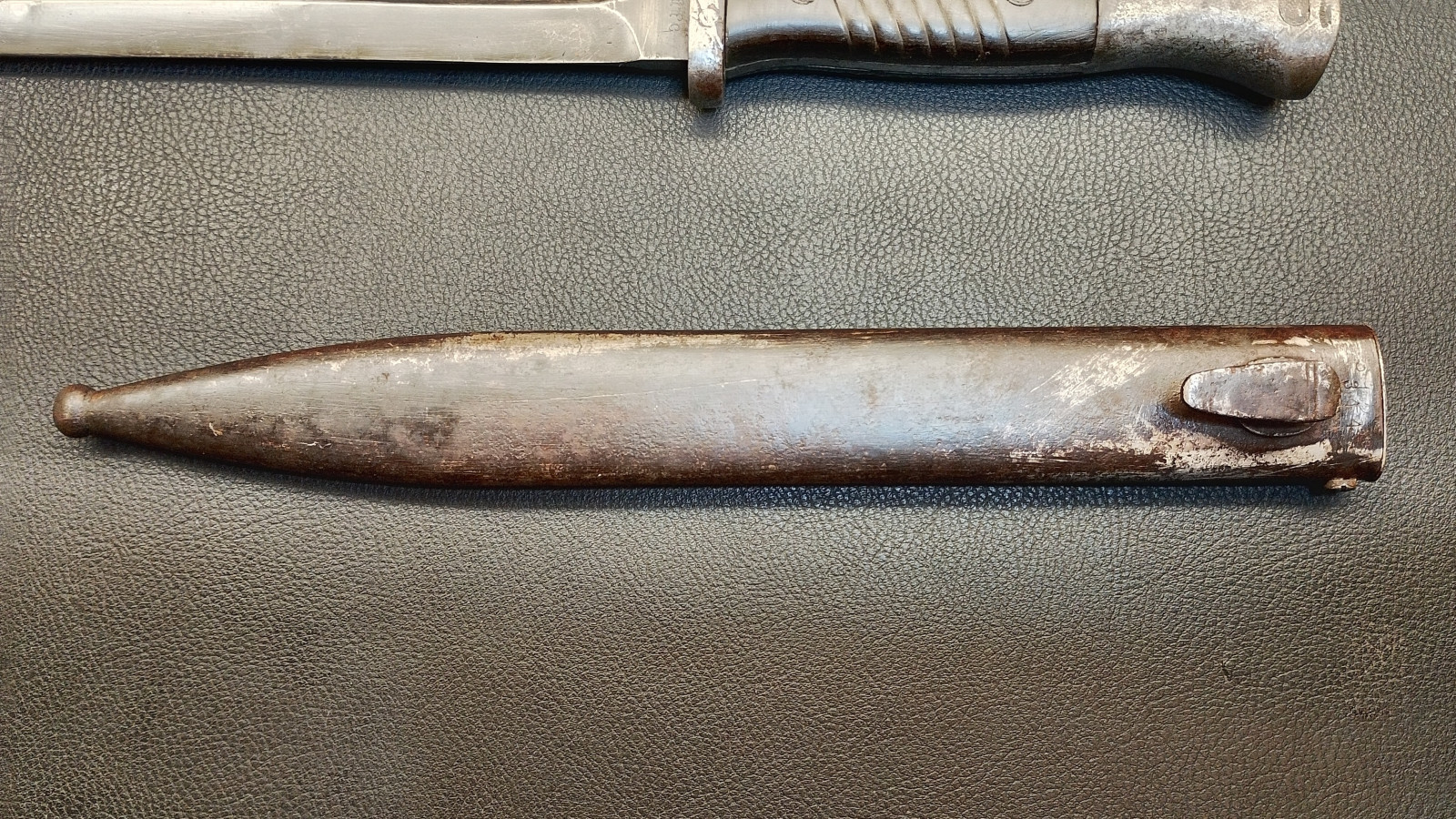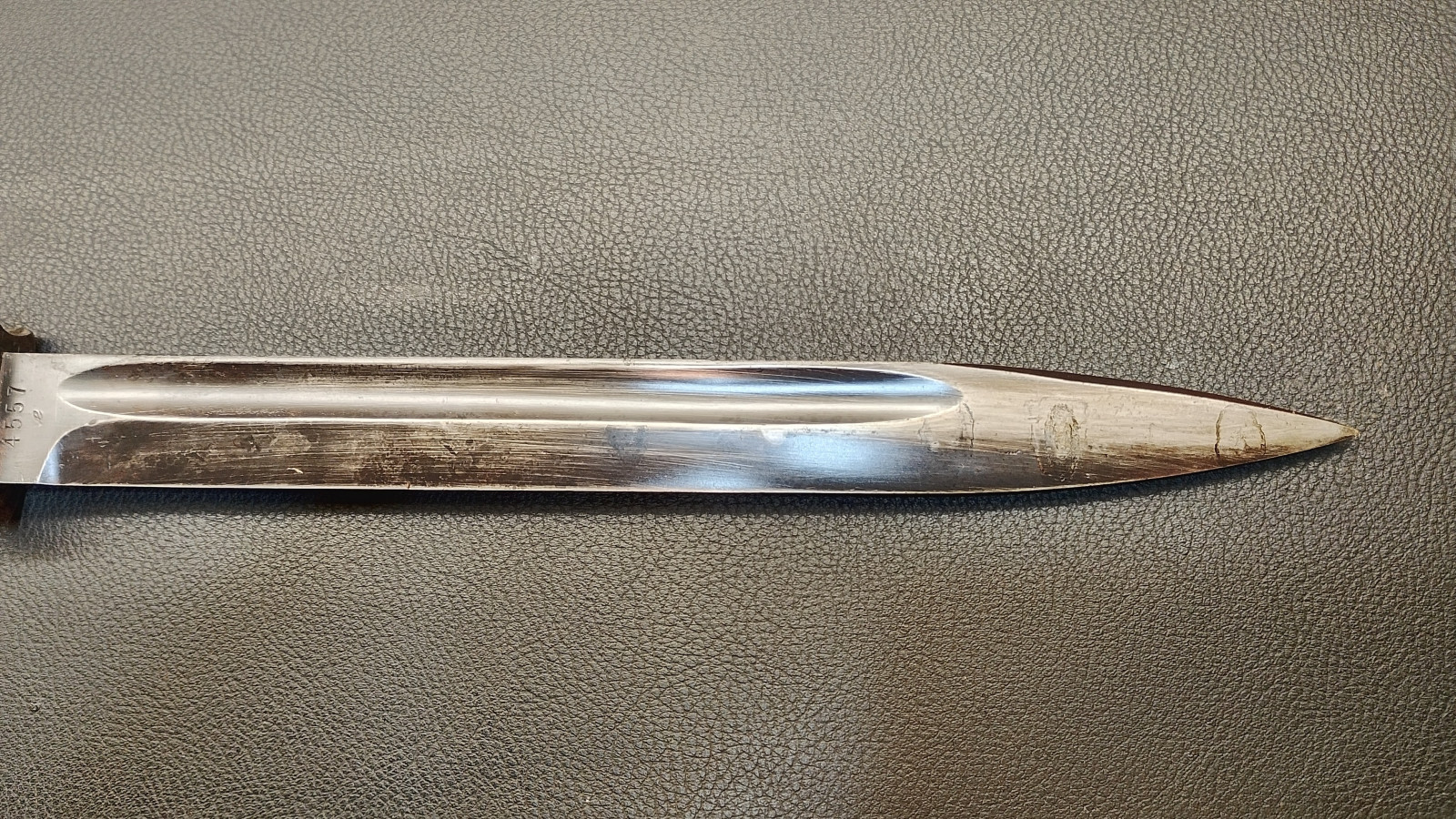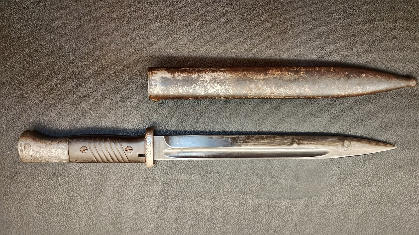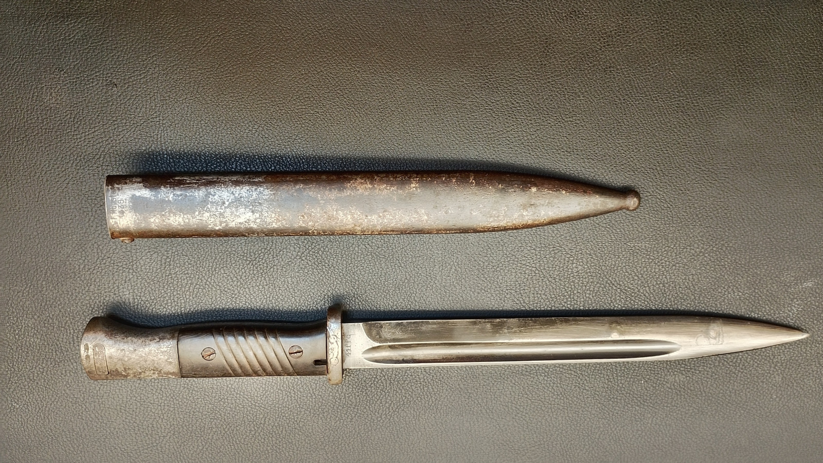 Verkaufe aus meiner Sammlung: Bajonett 84/98 ,WaA 883 , Klinge rechts 4557 , Klinge links 41 f f c ,Klingenlänge 25,2 , Gesamtlänge ohne Scheide 38,5 cm , Drücker leichtgängig , Scheide nicht Nummerngleich , Bestempelt mit E.u.F Hörster 1938 . Erhaltungszustand ist Ansichtssache . Bitte schätzen Sie den Zustand des angebotenen Artikels anhand der Bilder selbst ein .Bilder sind Gegenstand der Auktion . ,,,,,,Viel Spass beim Bieten,,,,