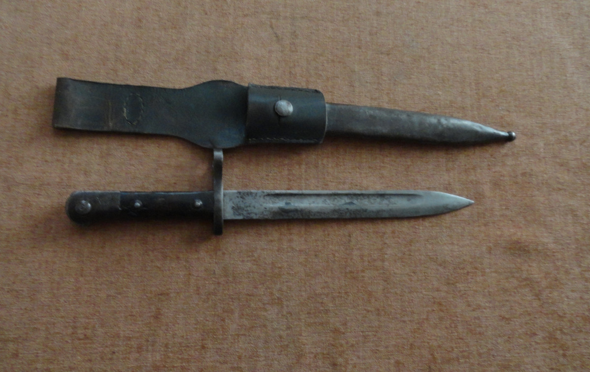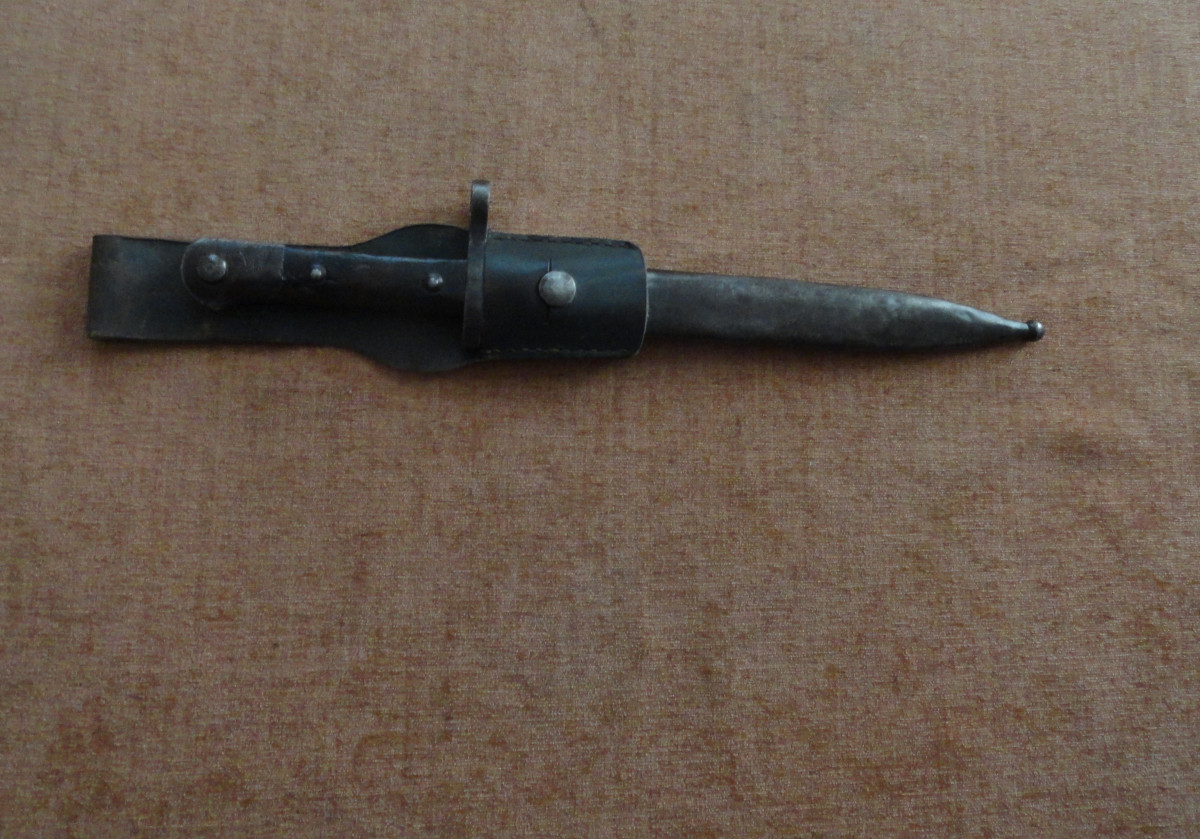 Süngü Bajonett M. 1935 in Tragetasche das ganze mit alters und Gebrauchsspuren zb. Scheide mit kleineren Unebenheiten rückwärtig eine größere Delle.
