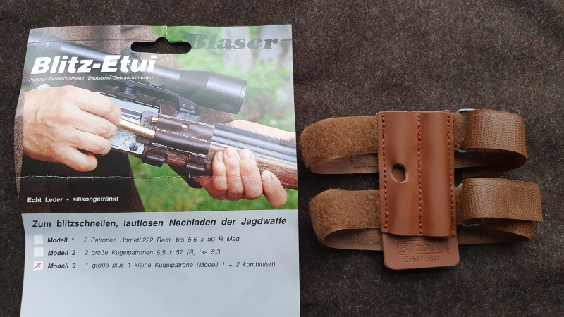 Zum Verkauf steht ein Blaser Blitz-Etui für kombinierte Waffen (mit großer und kleiner Kugel), aus Leder und mit Klettband.