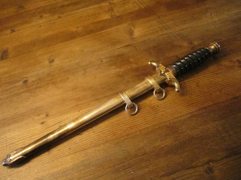 Heute bekommen. Bahnschutz Führerdolch 2.Generation. Tolles, schweres Stück. Scheide etwas angelaufen. Sieht wie Neusilber oder vernickelt aus. Die Trageringe kann man abnehmen. Leider habe ich keinen Hersteller finden können. Ich habe ihn aber auch nicht auseinander geschraubt. Seht selber. Achtet auch auf meine anderen Auktionen.