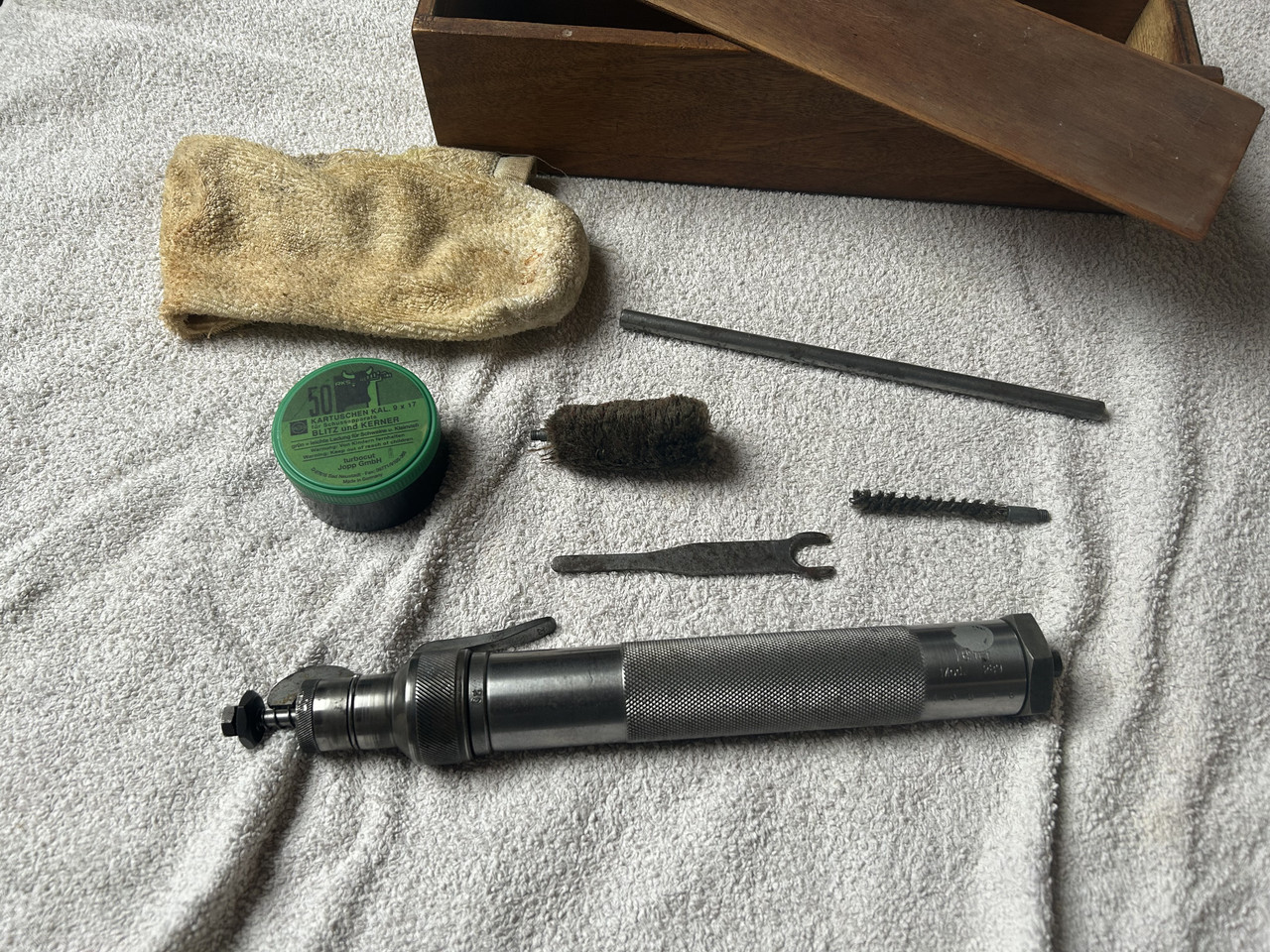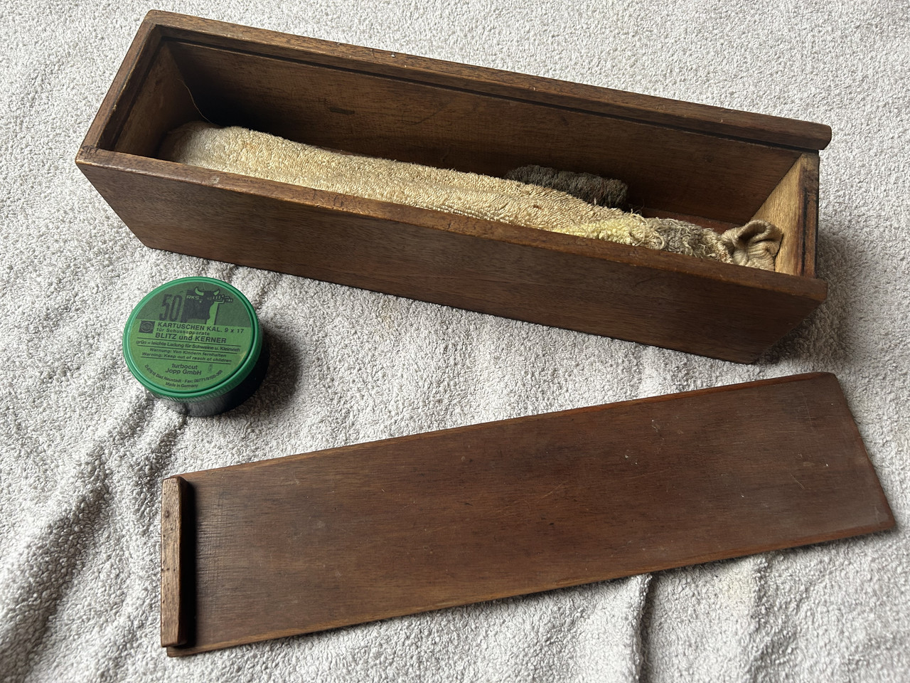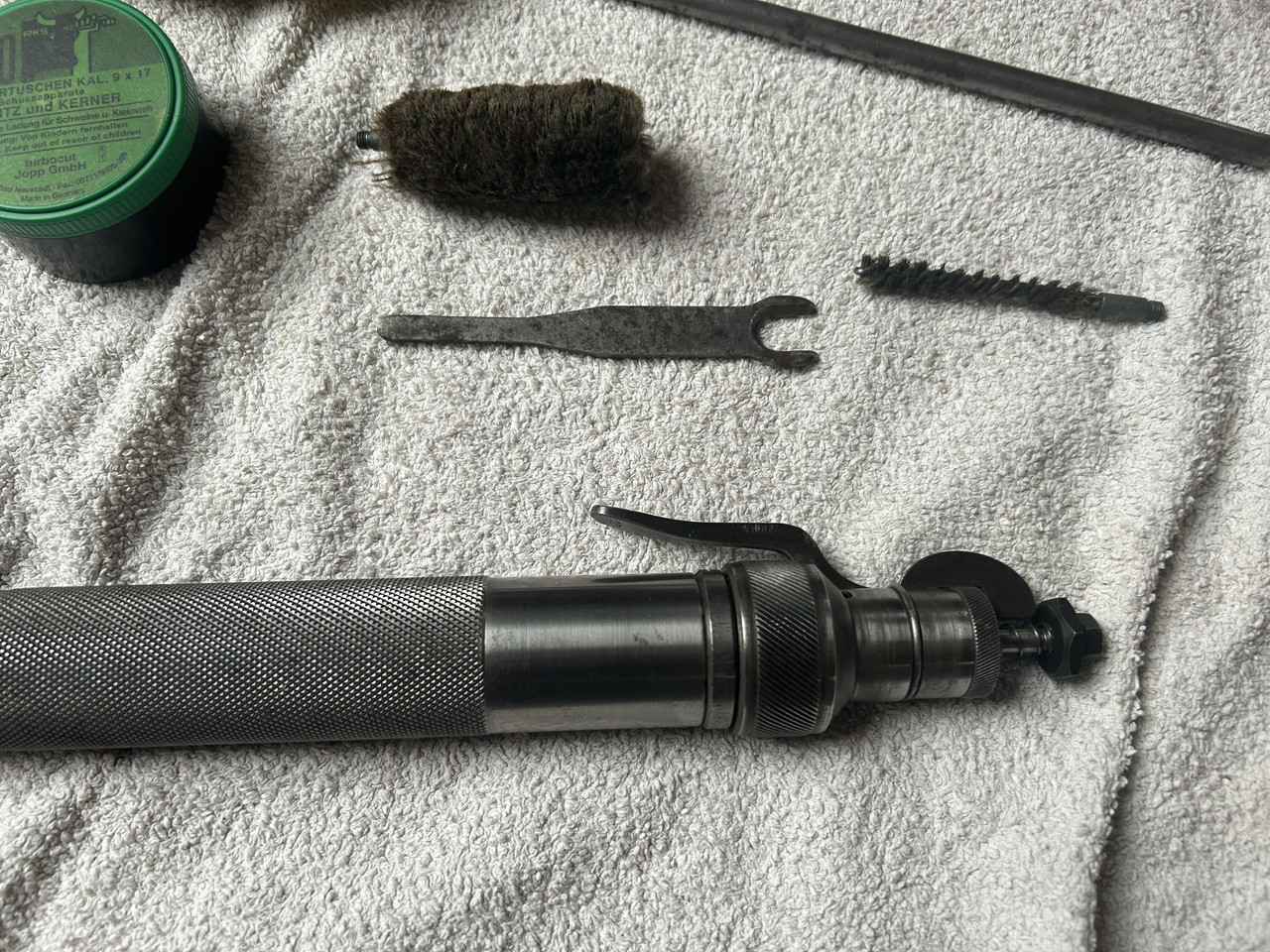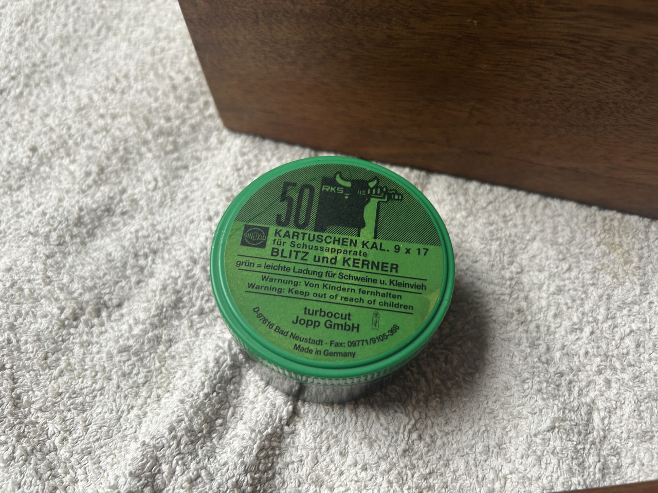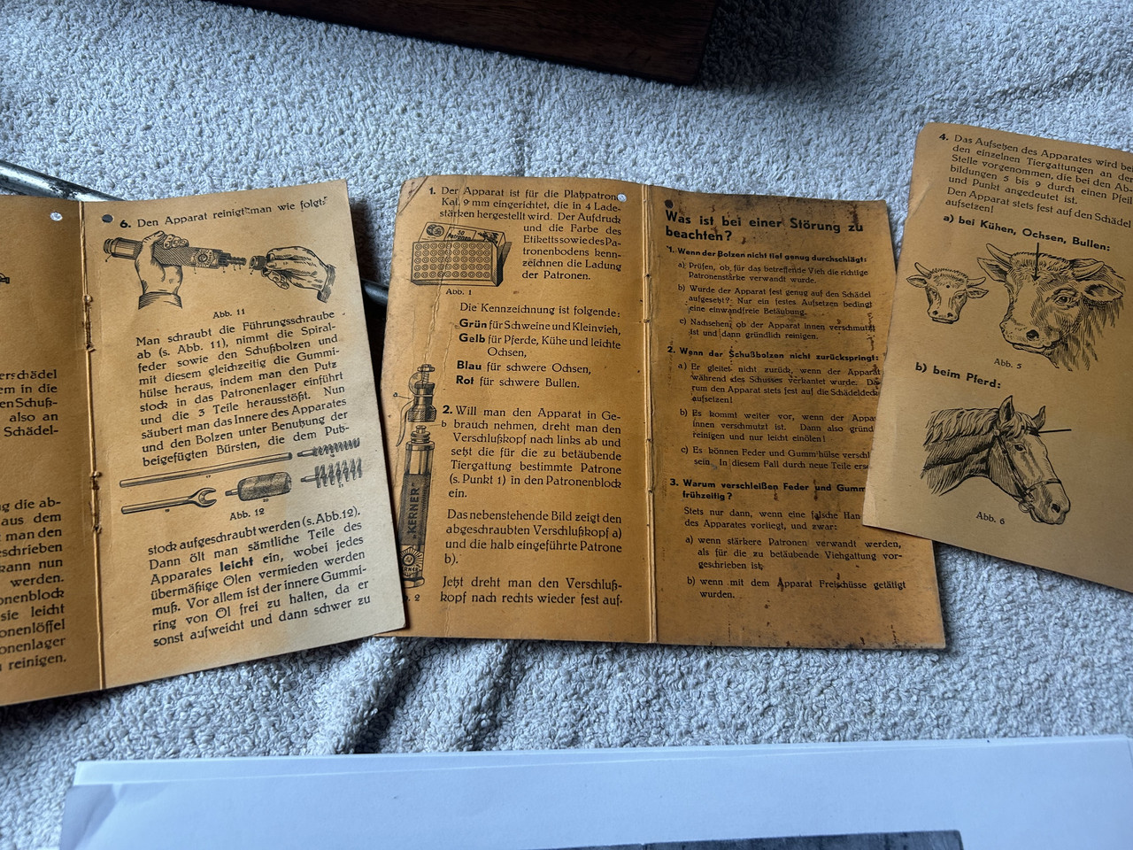 ohne Originalverpackung, mit Reinigungszubehör (siehe Fotos), Ersatzteillisten / Anleitung (Original + Kopie), Hülsenheber, 46 Stck. Kartuschen Kal. 9x17 GRÜN ( für Schweine und Kleinvieh), Oelsocken und Holzkiste.